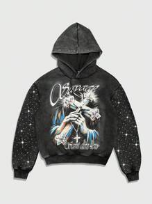 Goth Men's Letter & Cross Print Rhinestone Decor Drawstring Hoodie Sweatshirt , Fall