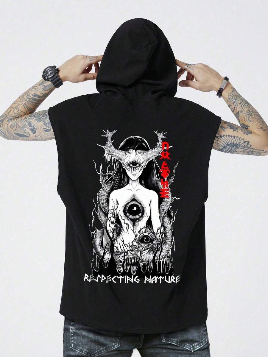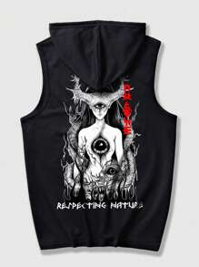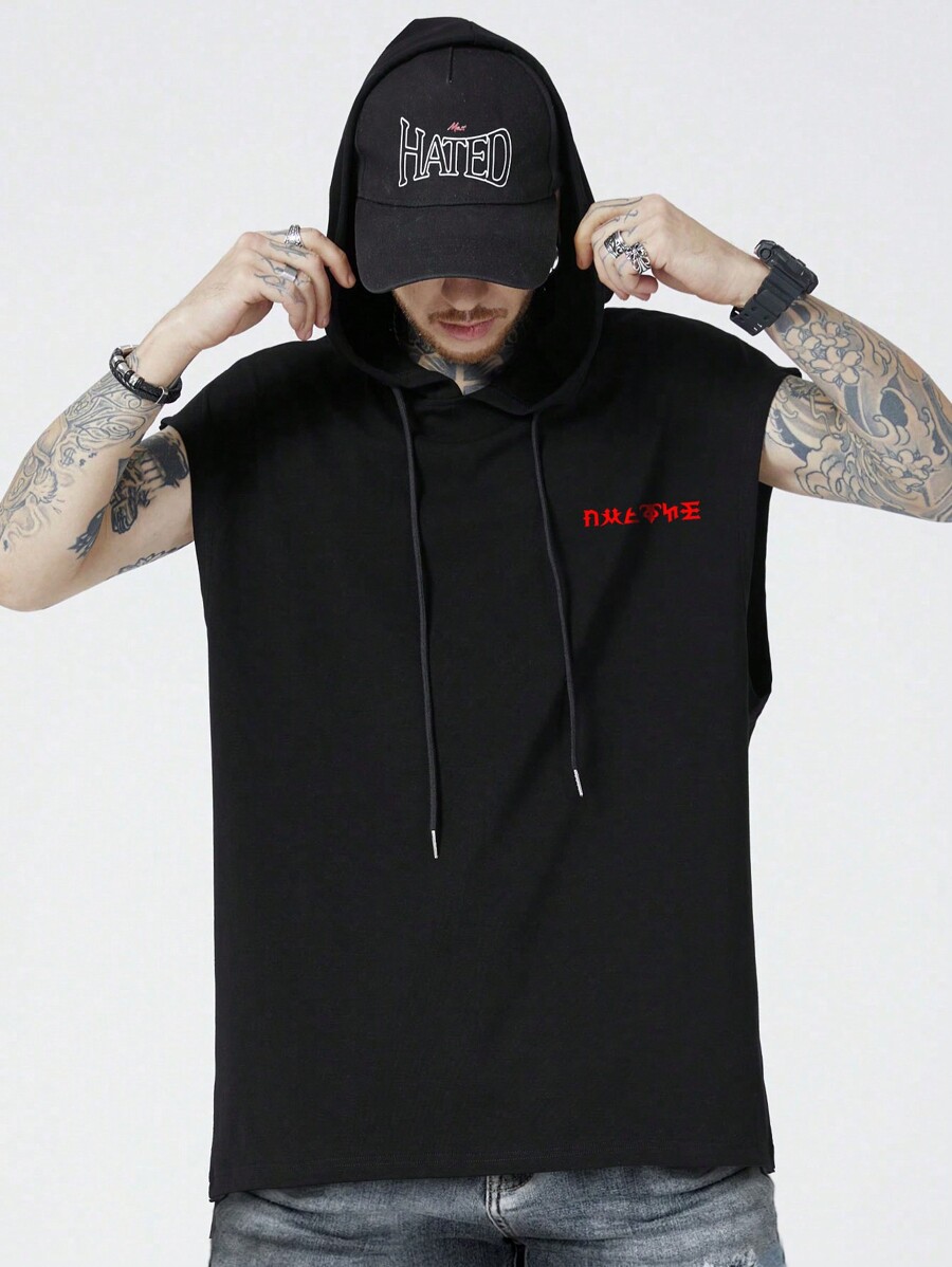 Goth Men's Sleeveless Hooded Tank Top With Character & Letter Print, Suitable For Daily Wear In Spring And Summer, School