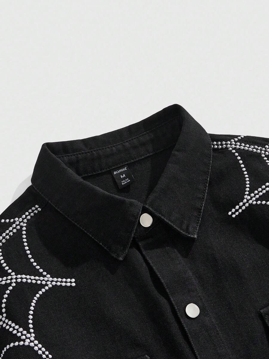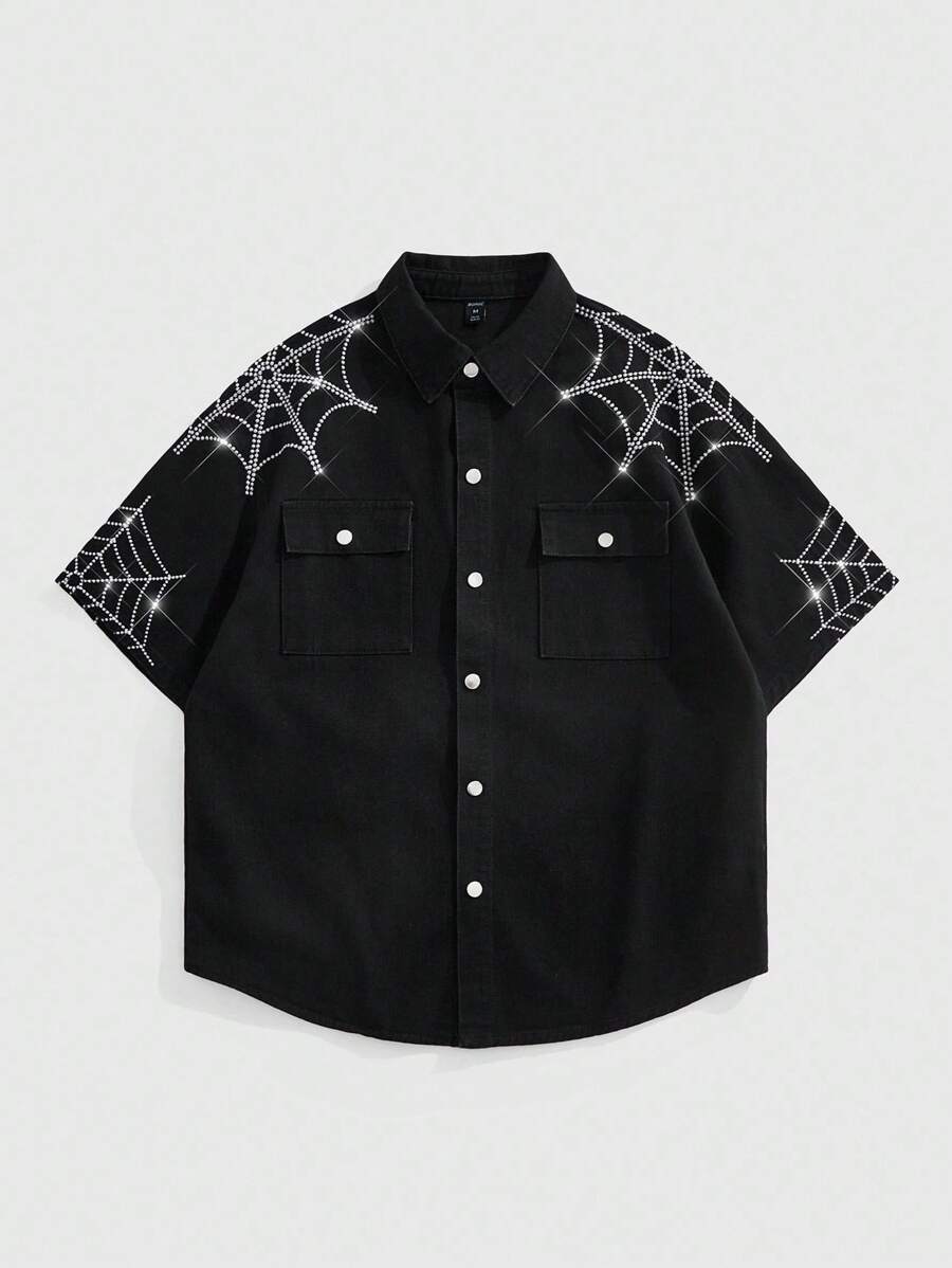 Goth Men's Spider Web Embroidered Short Sleeve Single-Breasted Casual Denim Shirt, Halloween