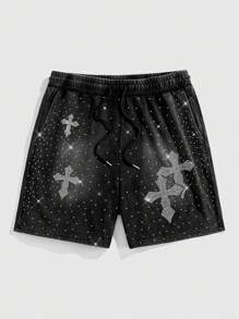 Goth Men's Summer Casual Street Stylish Cross Pattern Rhinestone Drawstring Waist Side Pockets Loose Shorts