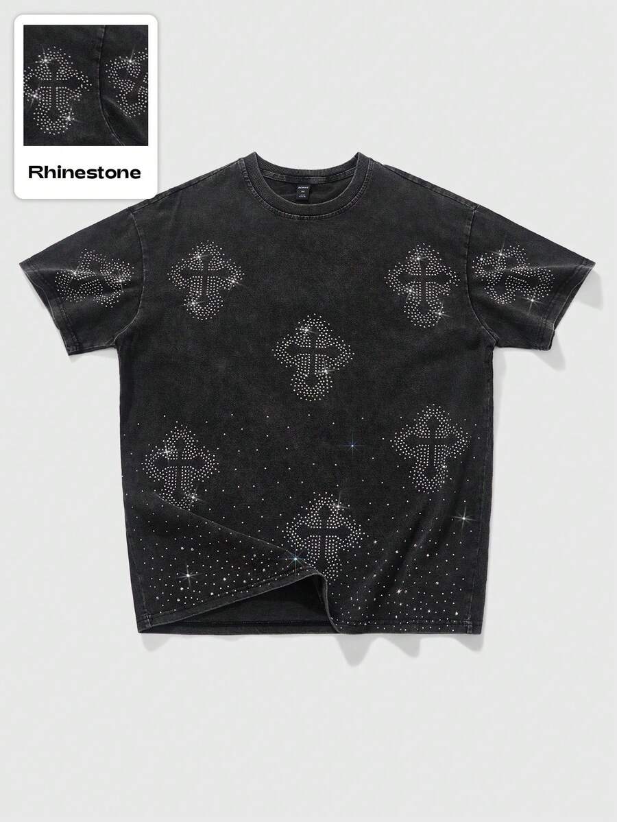 Goth Men's T-Shirt With Cross Pattern Glitter Effect, Vintage American Street Style, 2000s Style