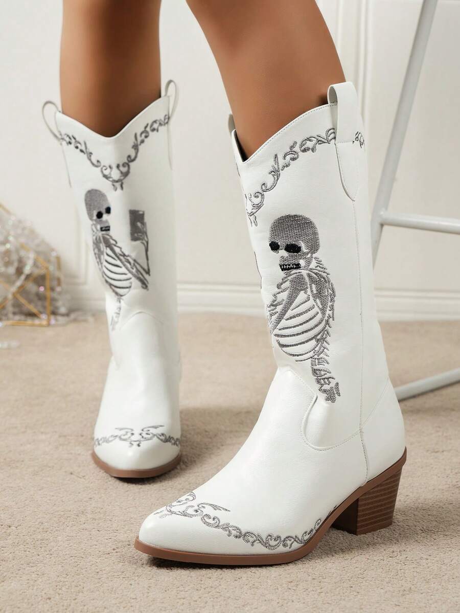 Goth New Cross-Border Four-Season High Boots Women's Skull Embroidery Western Cowboy Boots, Cowgirl Boots, White Boots