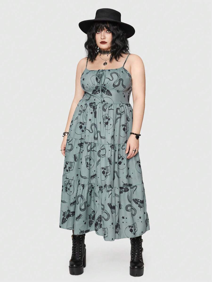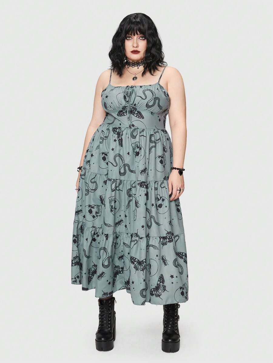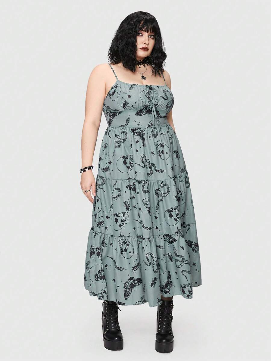 Goth Plus Butterfly & Skull Print Drawstring Front Ruffle Hem Cami Dress
