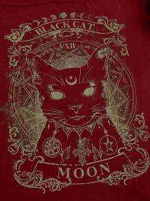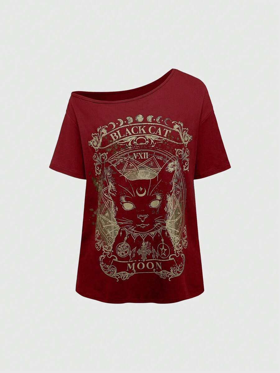 Goth Plus Size Asymmetric Collar Loose Drop Shoulder Black Cat Mysterious Graphic Print Short Sleeve T-Shirt