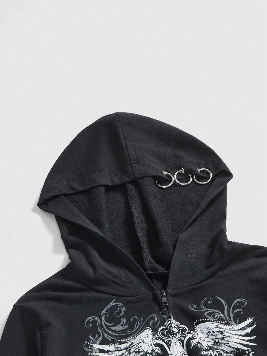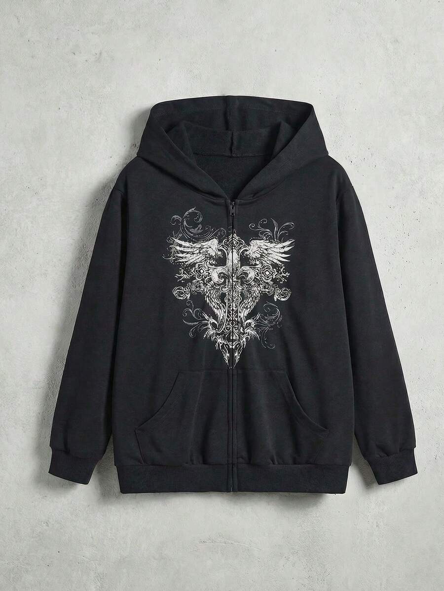 Goth Plus Size Black Iris Flower Wing Print Plaid Metal Ring Pullover Sweatshirt, Autumn/Winter Plus Size Women Sweatshirt, Loose Fit Casual Women Sweatshirt, Plus Size Women Black Sweatshirt Jacket