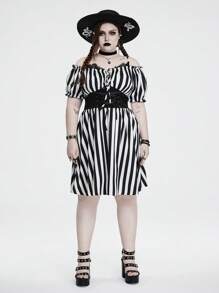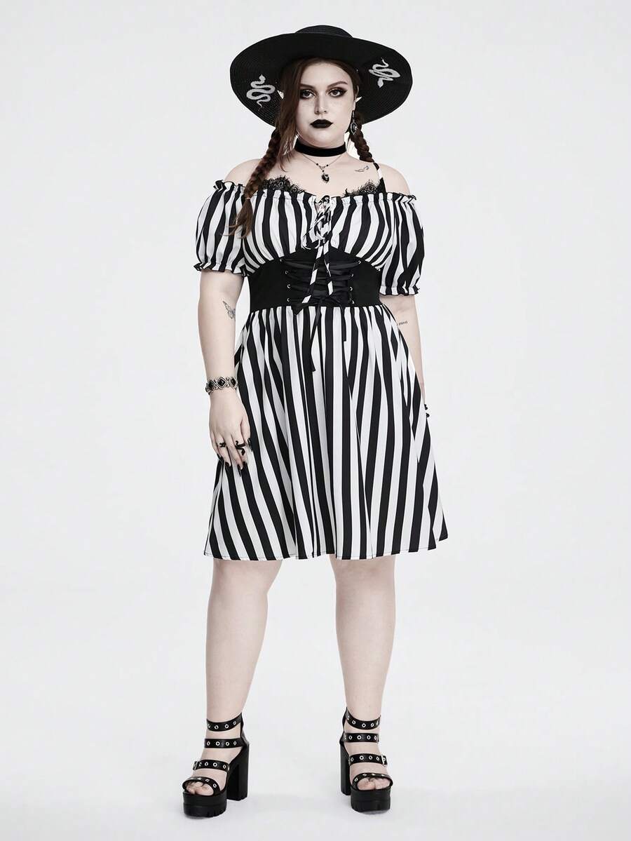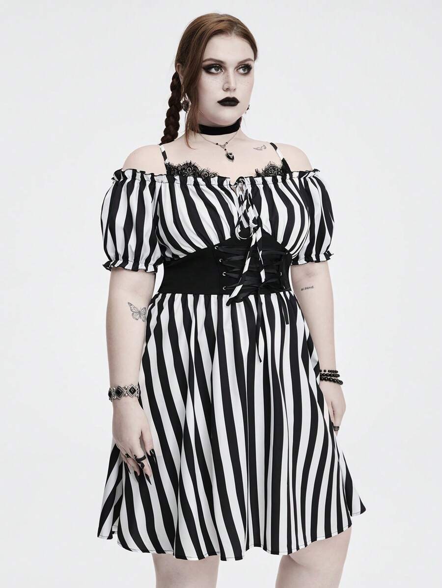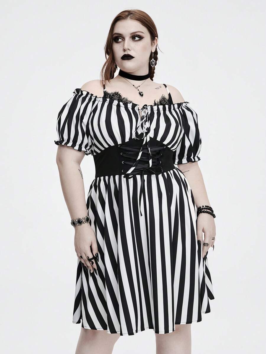 Goth Plus Size Black & White Striped Patchwork Dress With Waist Belt