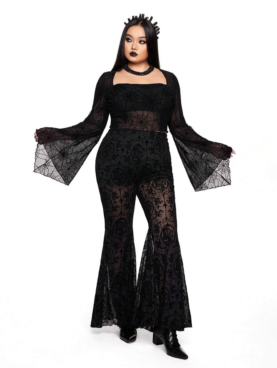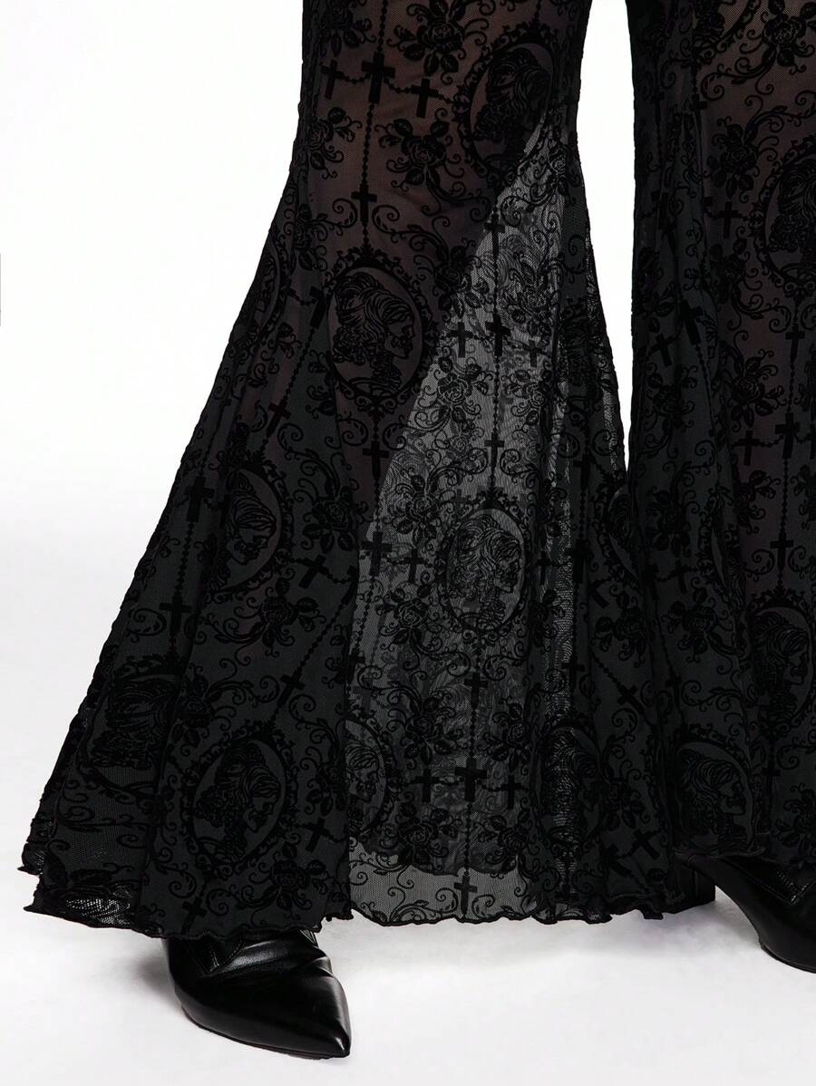 Plus Size Dark Gothic Vine Skull Pattern Flocked Flare Pants