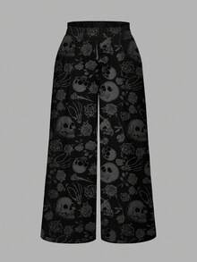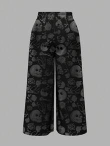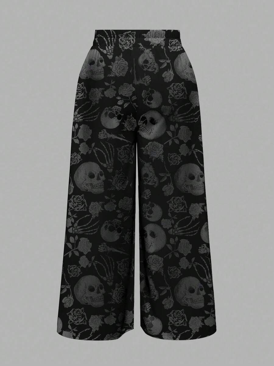 Plus Size Gothic Dark Mysterious Vintage Skull Rose Floral Print Loose Wide Leg Pants, Sexy For Valentine's Day & Halloween