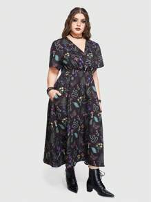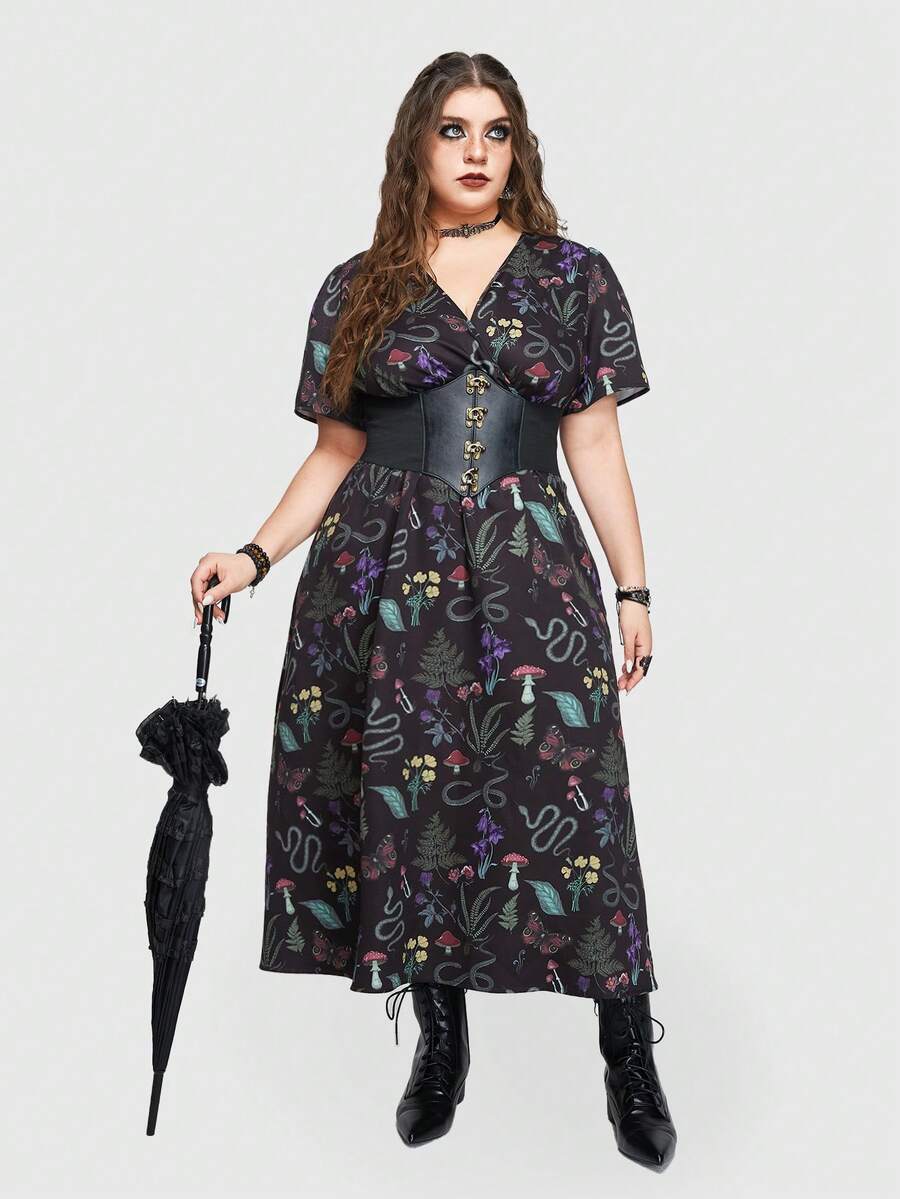 Plus Size Gothic Style V-Neck Dress With Plant And Snake Print For Women