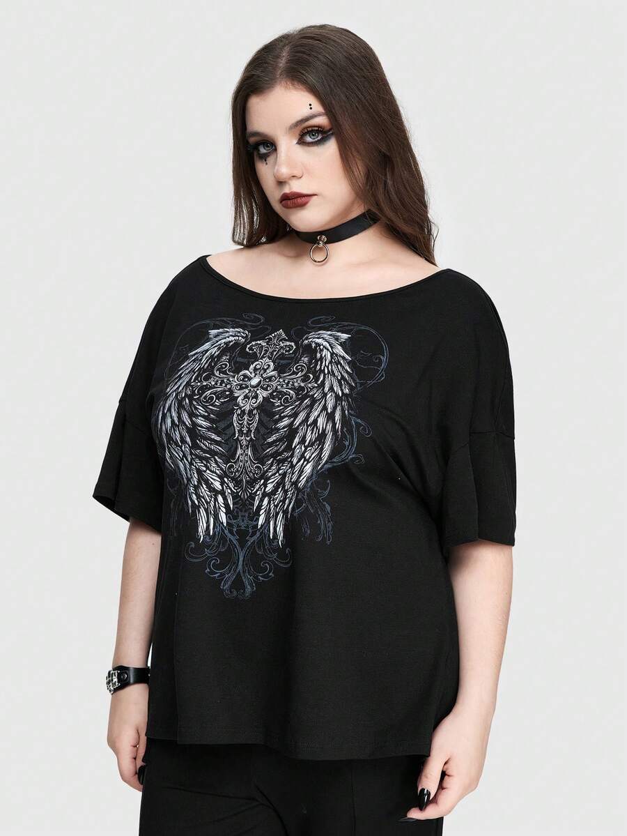 Goth Plus Size Punk Cross & Wing Printed Rhinestone Embellished Loose T-Shirt With Boat Neck And Backless Design, Graphic Tee