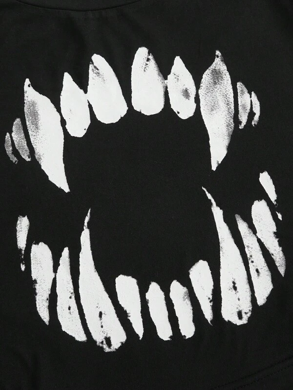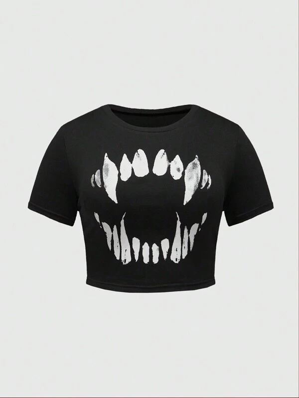Plus Size Summer Casual Slim Fit Cropped Tee With Tooth Print, School