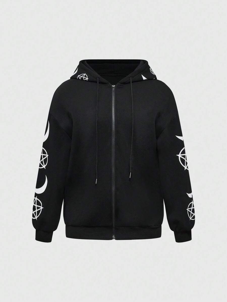 Goth Plus Size Women Cat Skull Print Long Sleeve Casual Zip Front Drawstring Hoodie Sweatshirt
