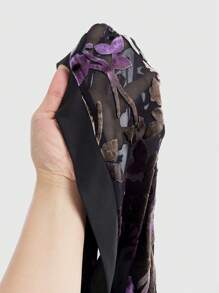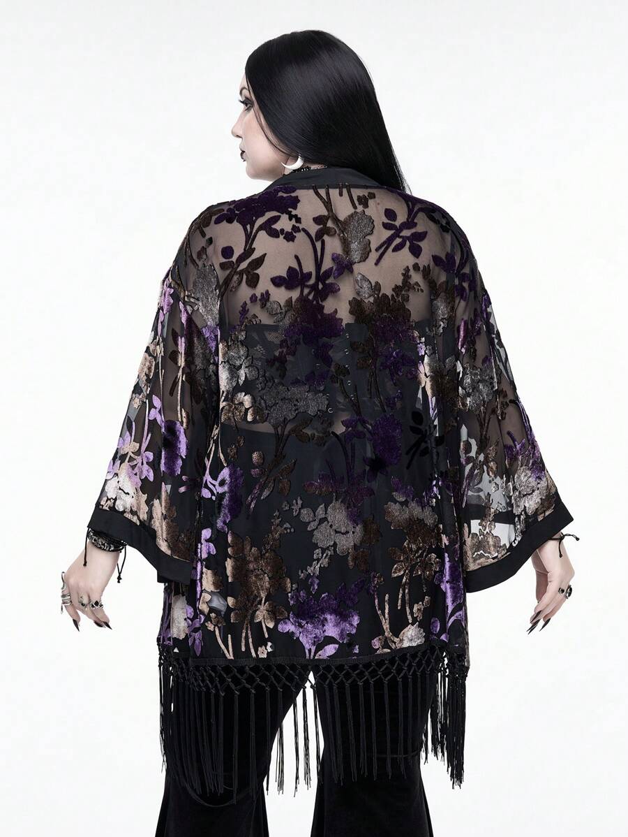 Goth Plus Size Women Gradient Floral Glitter Velvet Texture Asymmetrical Tassel Hem Blouse, Suitable For Multiple Occasions, Party