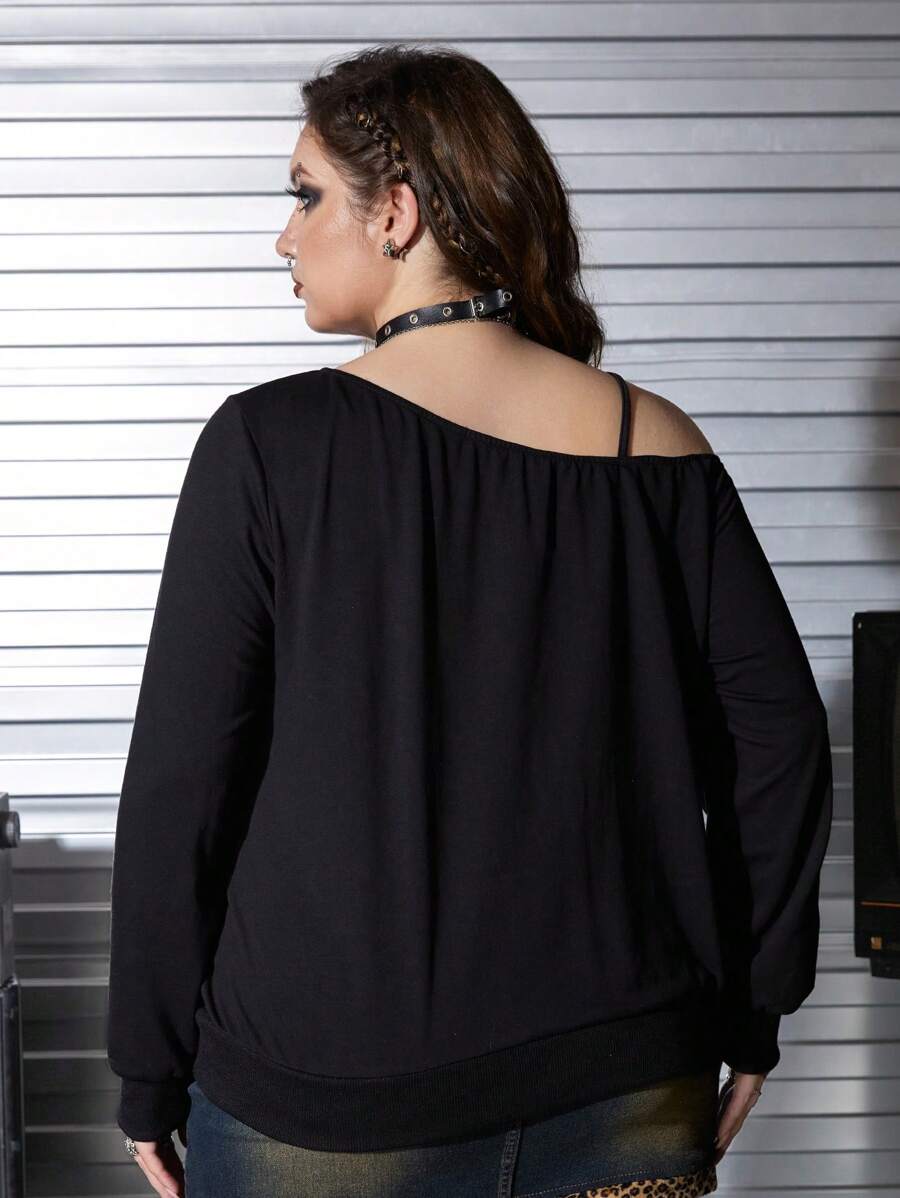 Goth Plus Size Women Oblique Shoulder Vintage Ombre Leopard Lip Graphic Loose Fit Long Sleeve Sweatshirt