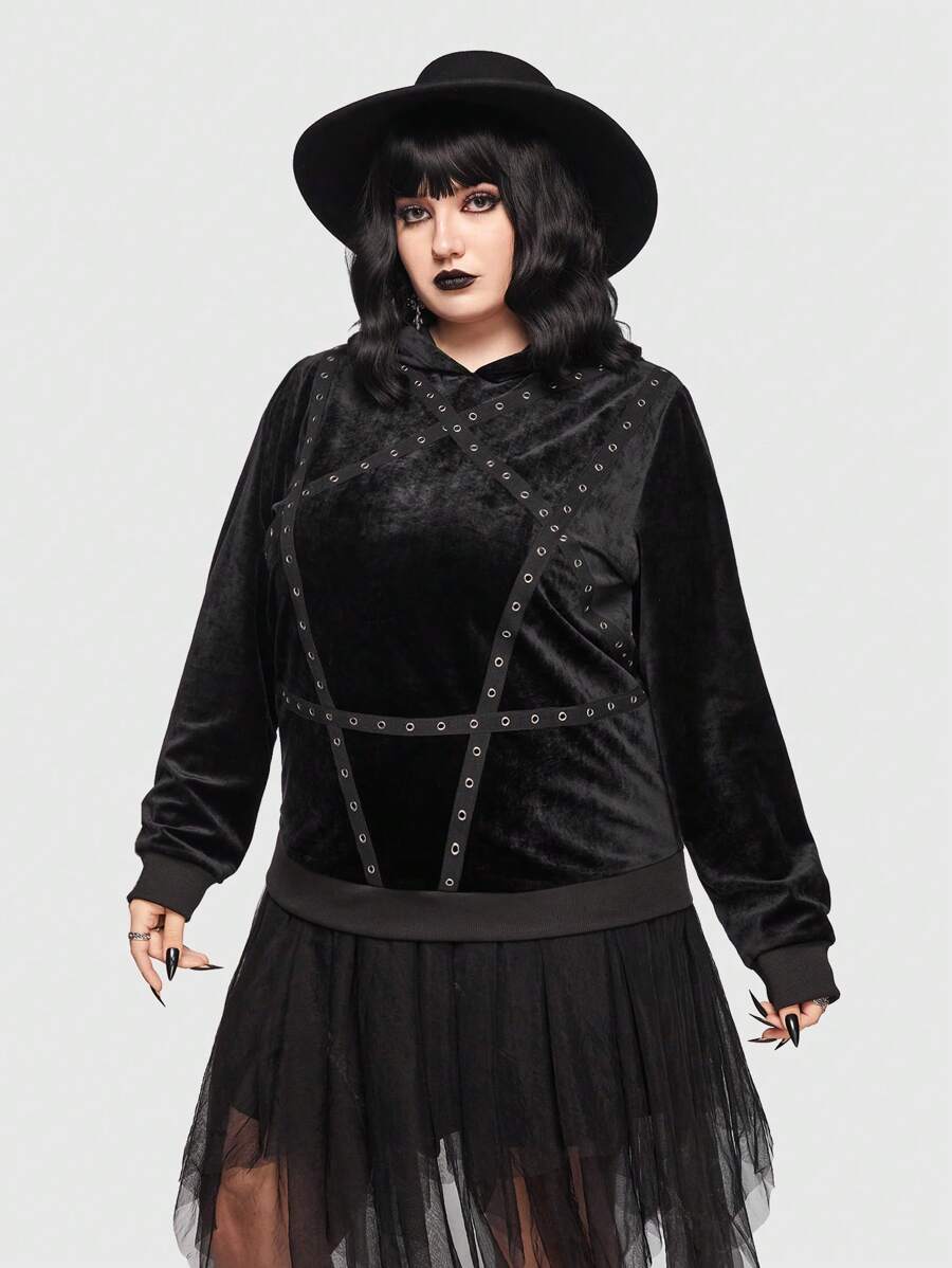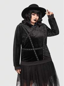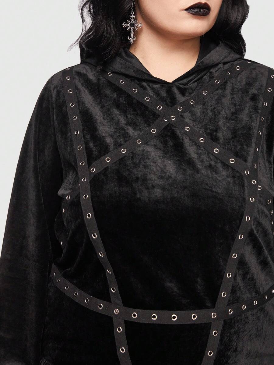 Goth Plus Solid Grommet Eyelet Detail Velvet Hoodie