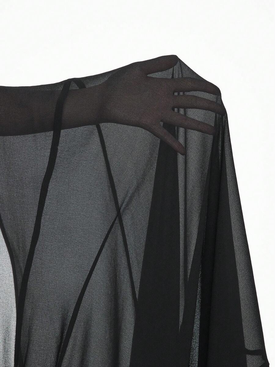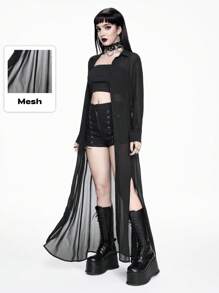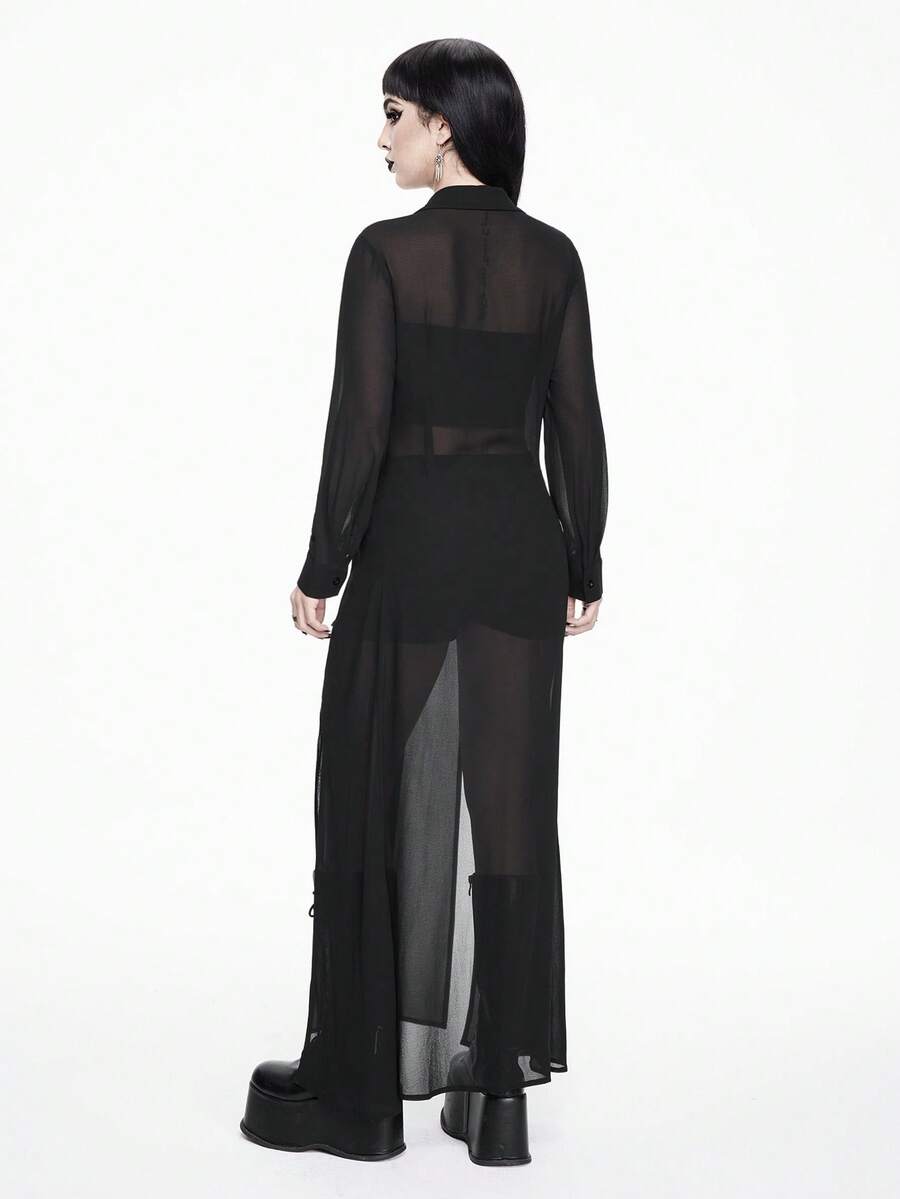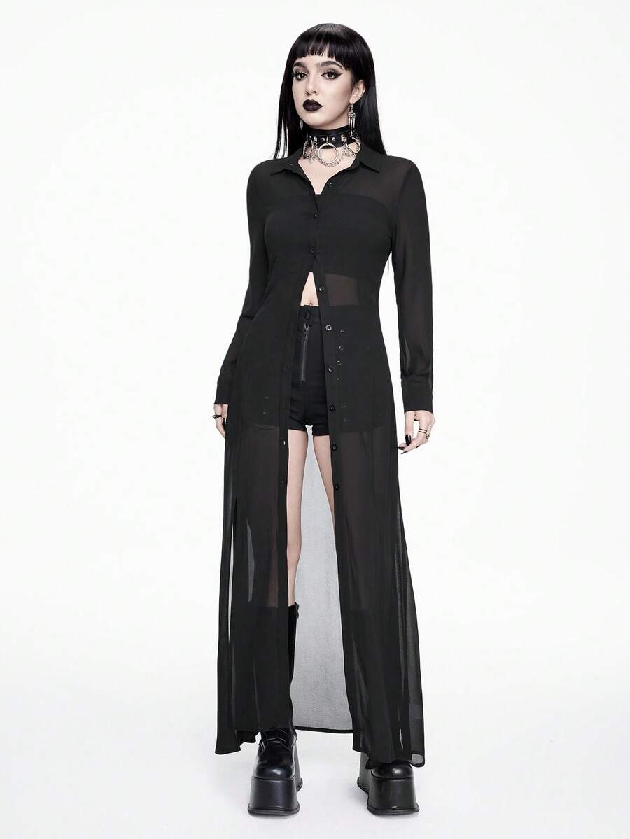 Professional Gothic Style Women's See-Through Shirt Dress With Thigh-High Slit