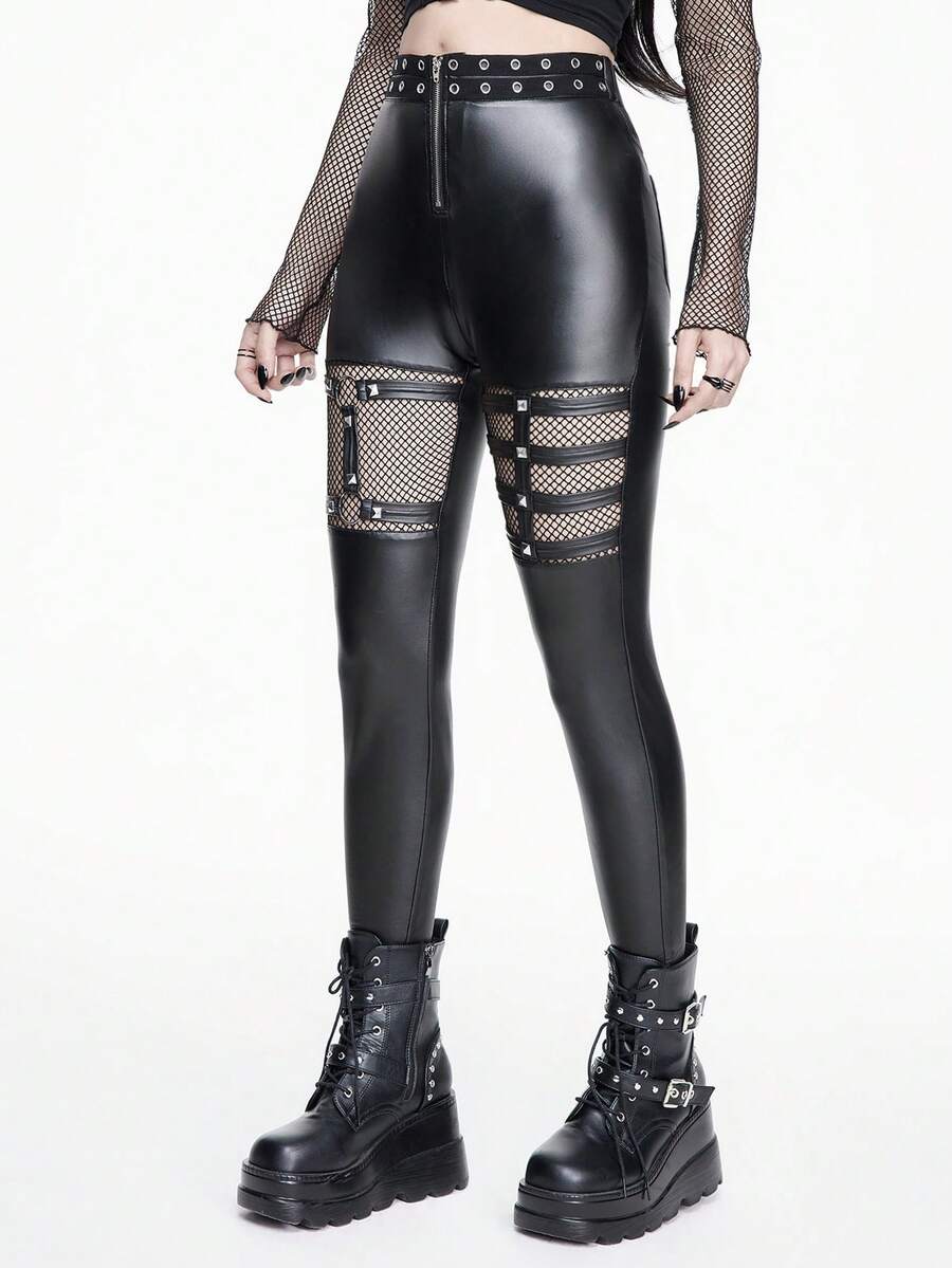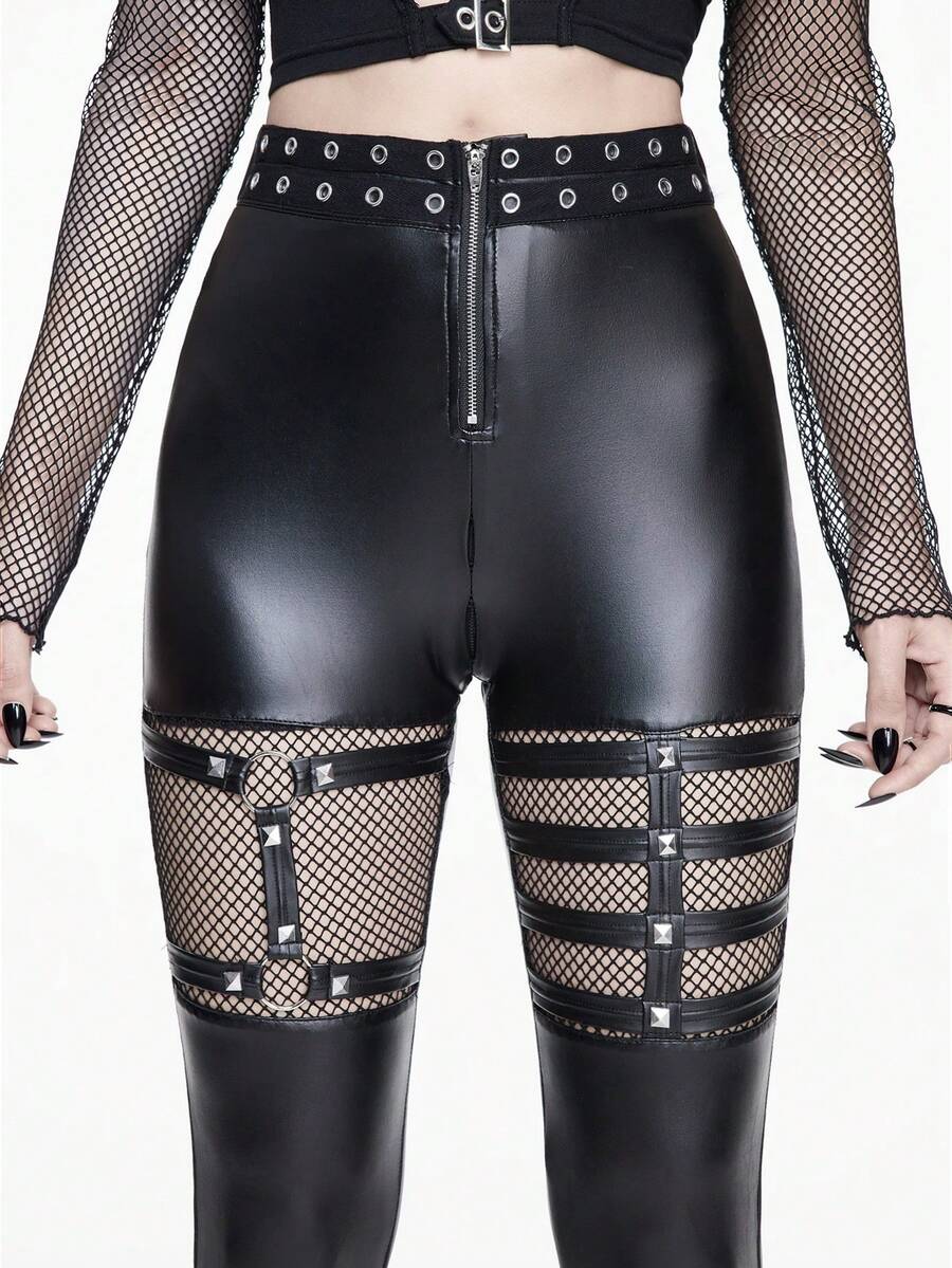 Goth Punk Fishnet Patchwork Rivet Embellished Skinny Leather Pants