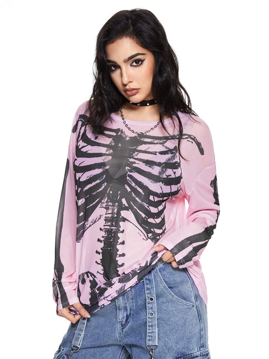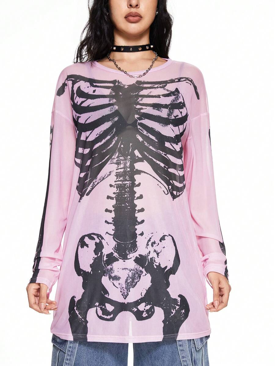 Goth Punk Style Semi-Sheer Valentine's Day Skeleton Print Top, Dark Color