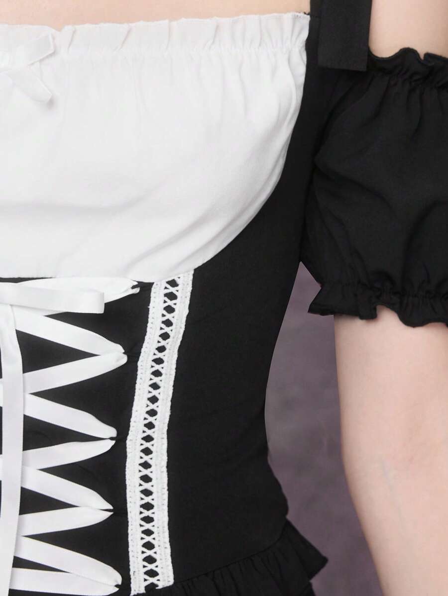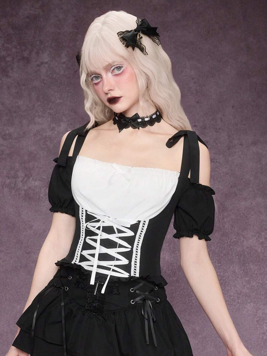 Retro Dark Gothic Doll Off Shoulder Bowknot Wrap Shoulder Strap Patchwork 2 In 1 Blouse