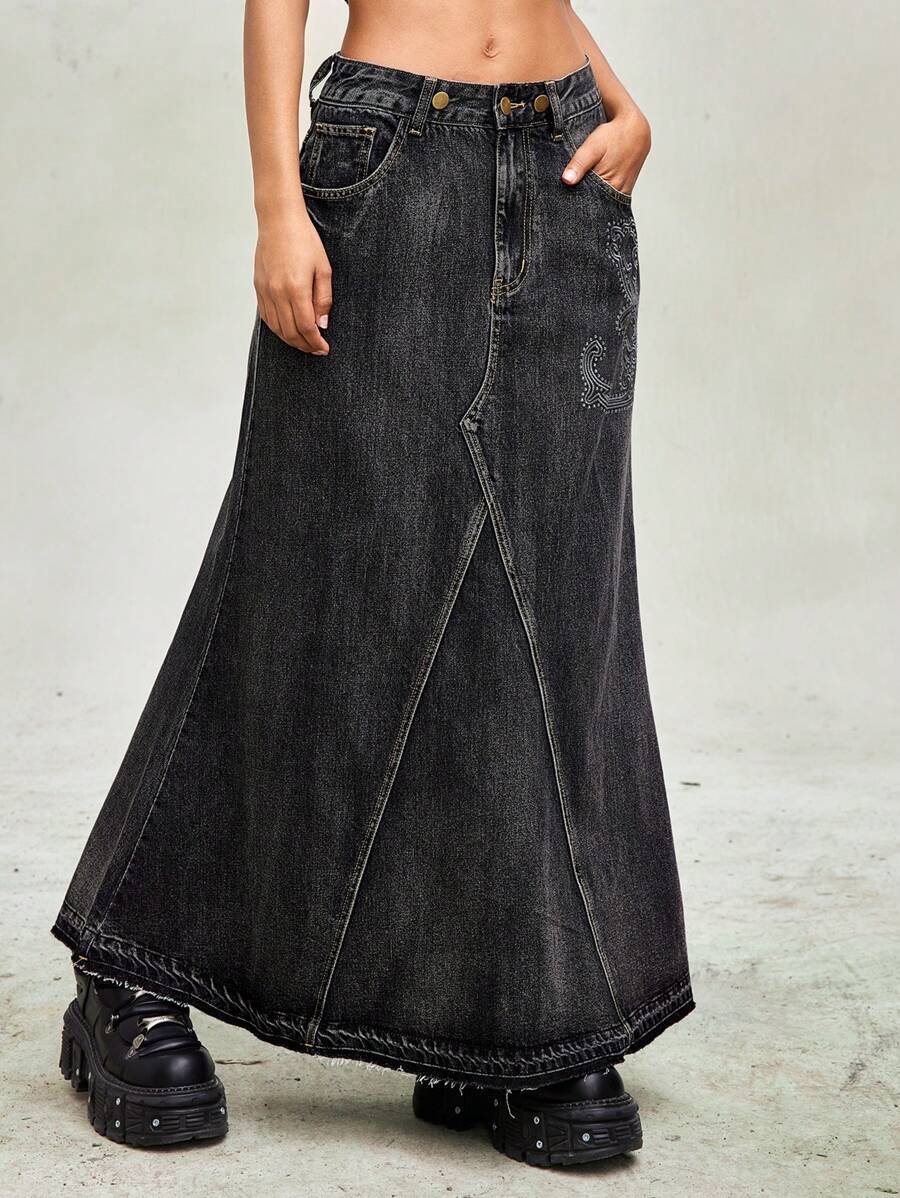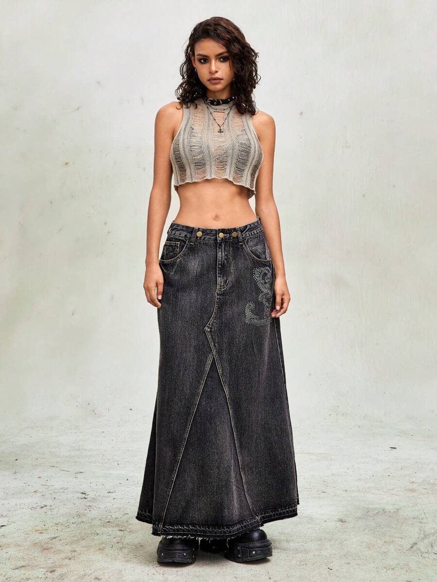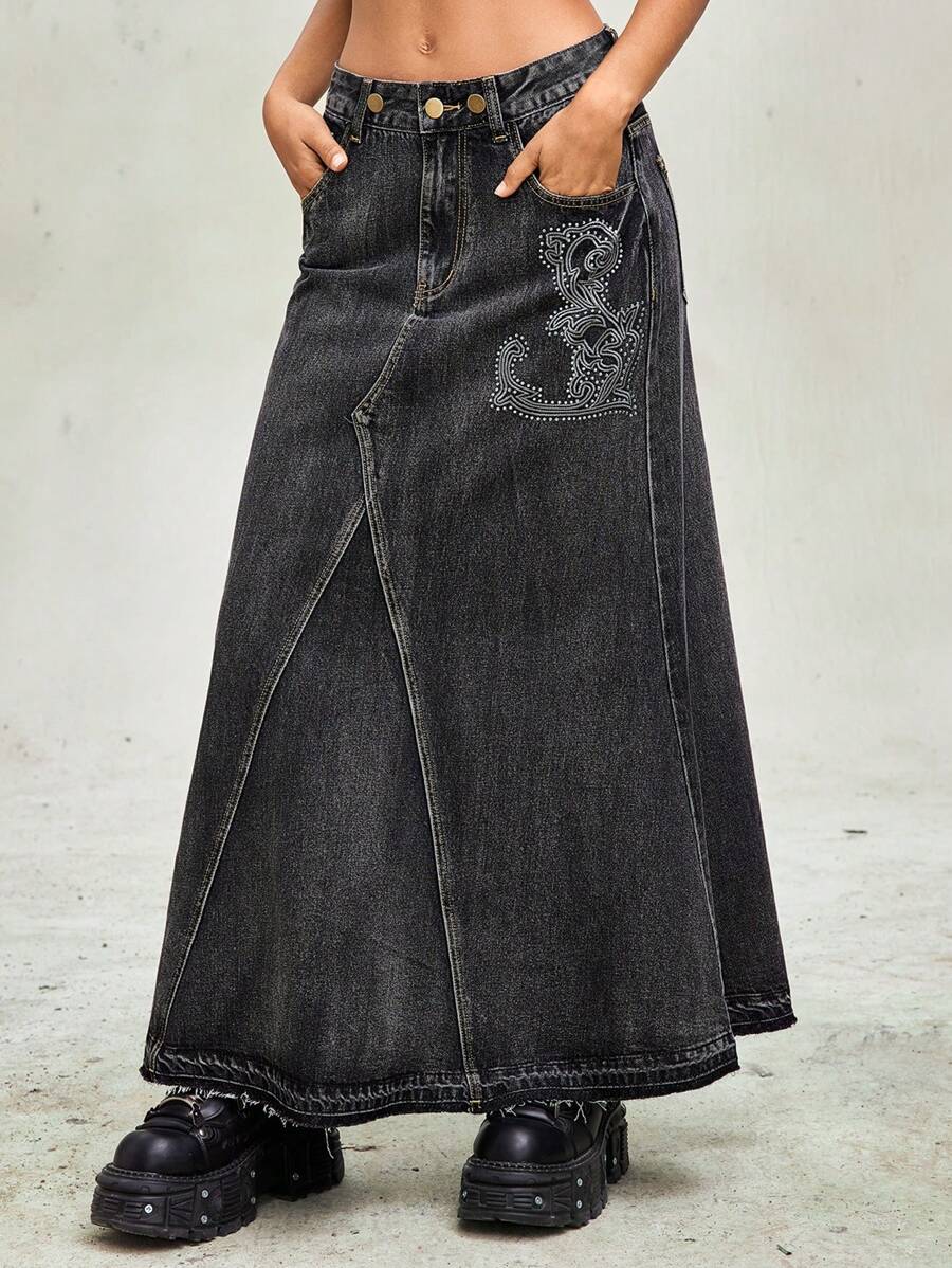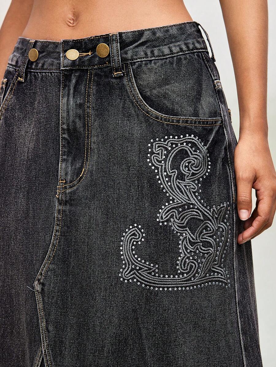 Goth Retro Vine Embroidered Rhinestone Distressed Washed Denim Asymmetric Hem A-Line Skirt For Women