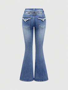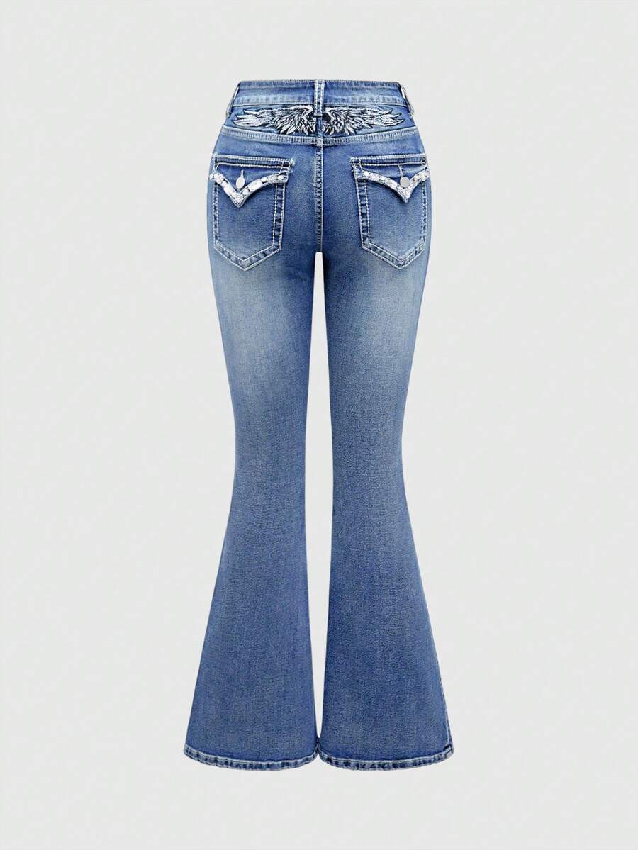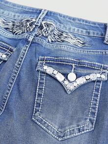 Goth Rhinestone Wing Embroidered Flared Leg Skinny Casual Low Waist Jeans