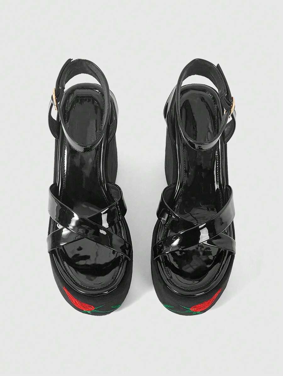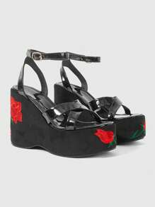 Goth Rose Embroidered Round Toe Platform Thick Sole Punk Rock Style PU Leather Black Wedge Sandals, Campus & Street Casual