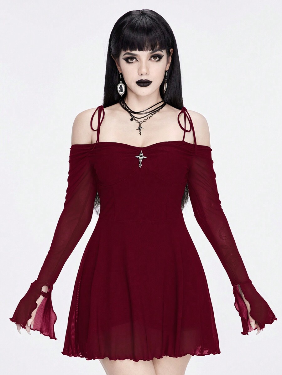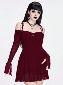 Goth Sexy Off-Shoulder Twist Mesh Criss-Cross Pendant Bodycon Dress