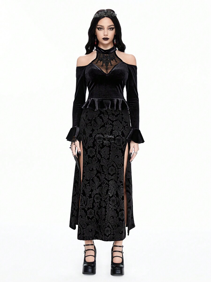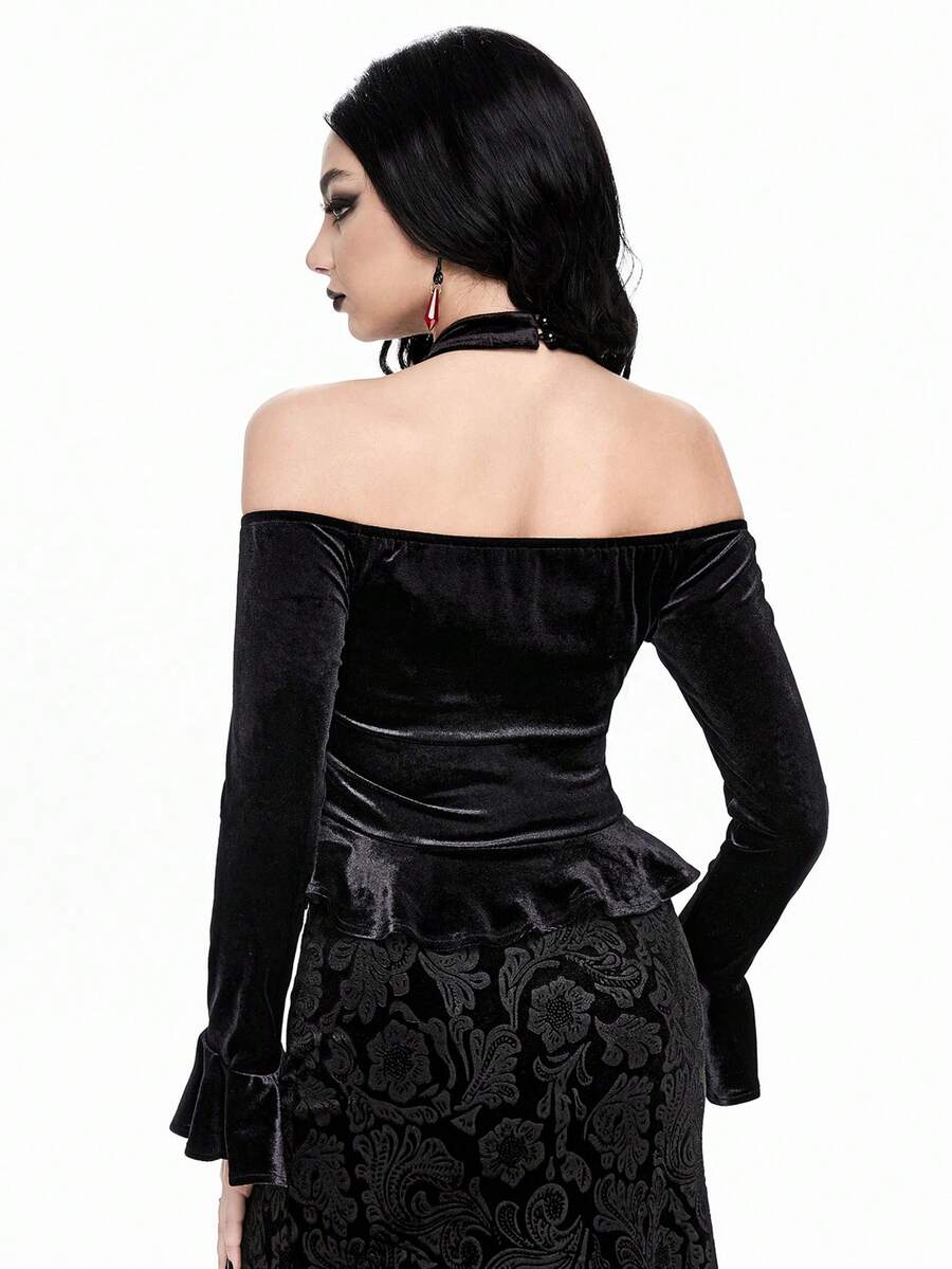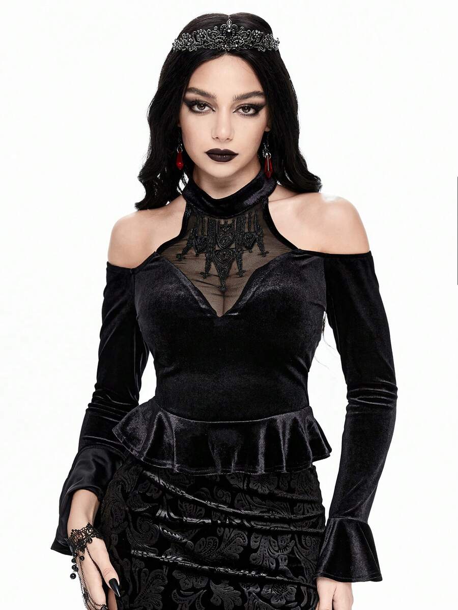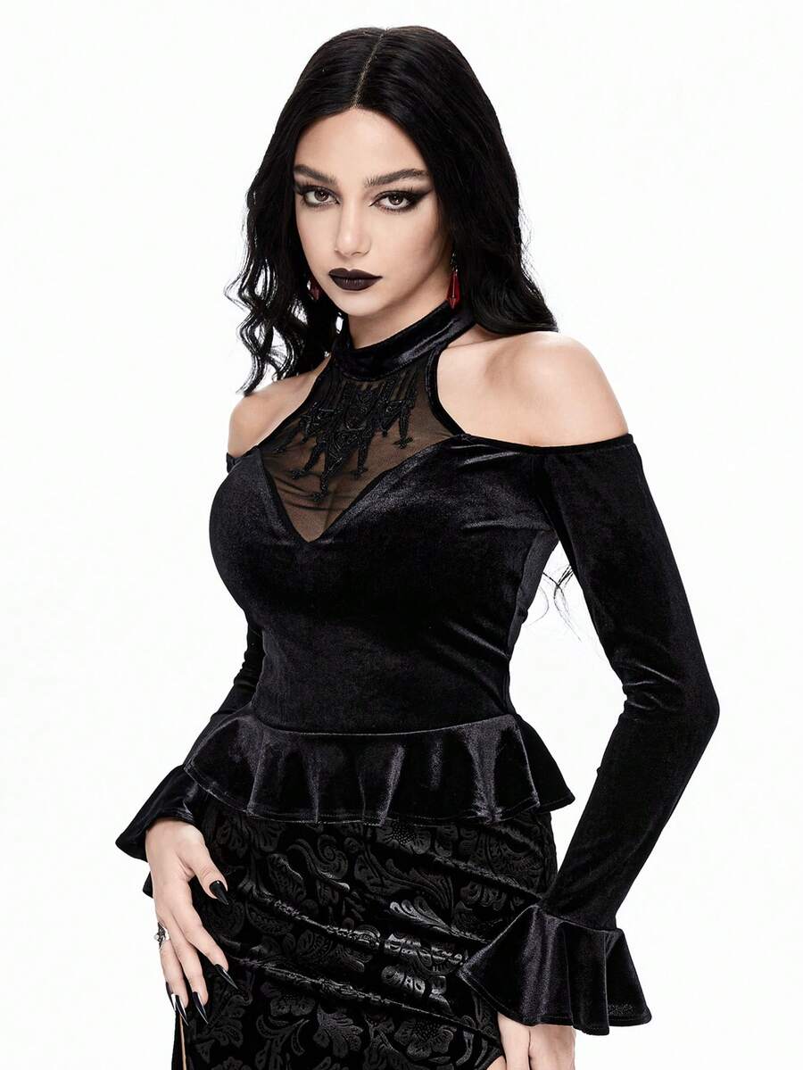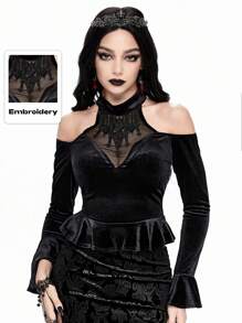 Goth Sexy Velvet Patchwork See-Through V-Neck Castle Embroidery Open Shoulder Flare Sleeve T-Shirt