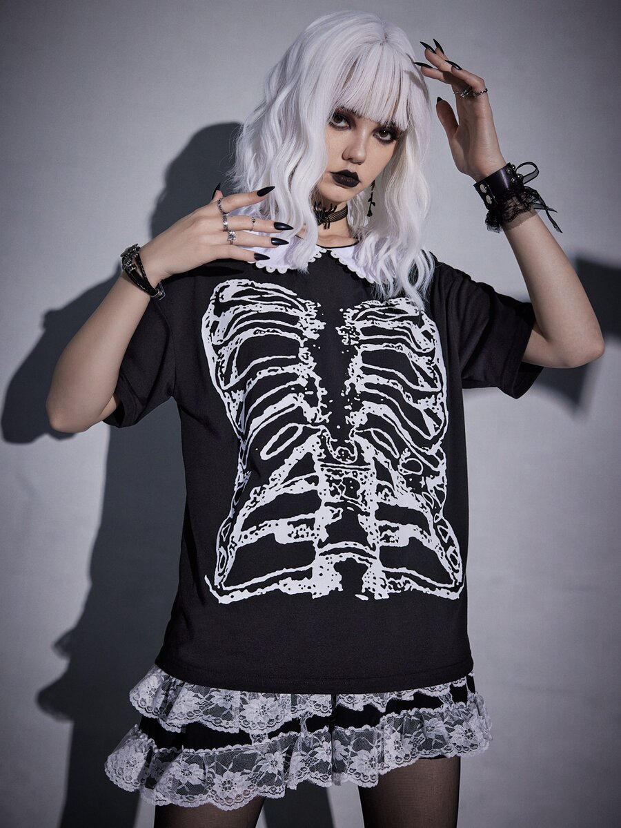 Goth Skeleton Print Contrast Collar Tee