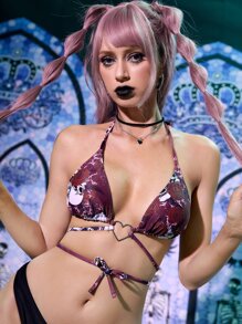 Goth Skull & Floral Graphic Heart-ring Linked Criss Cross Bikini Top
