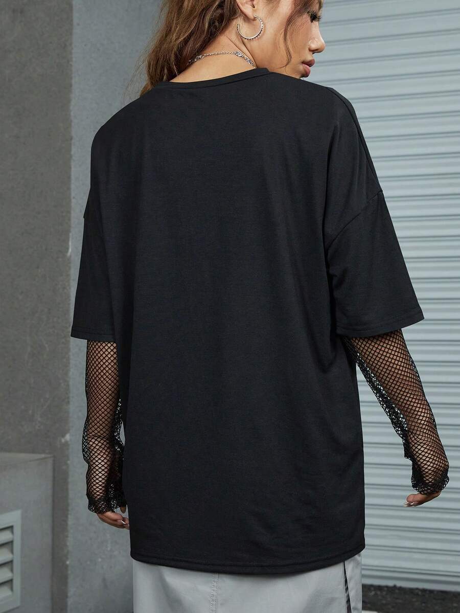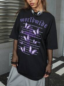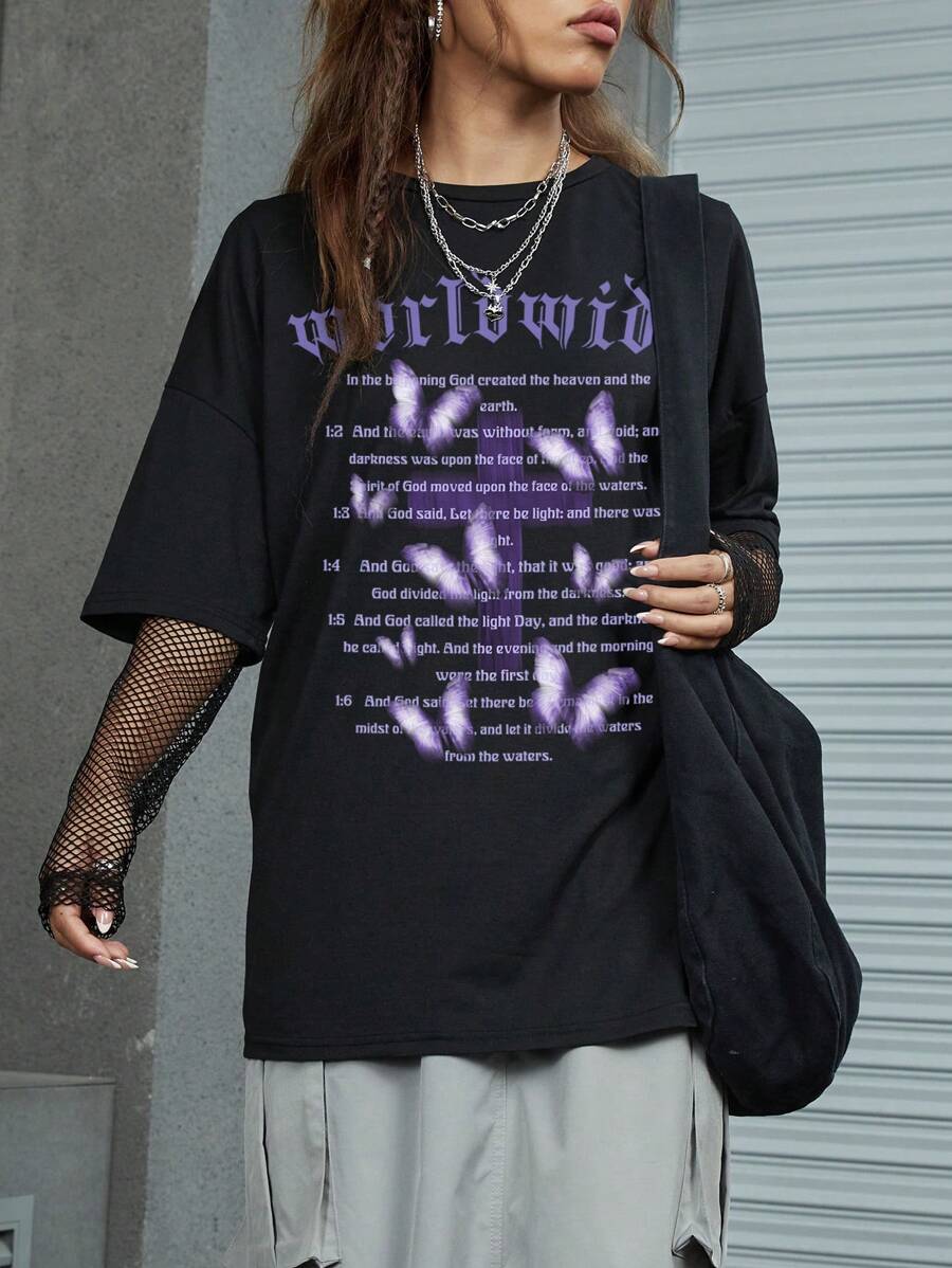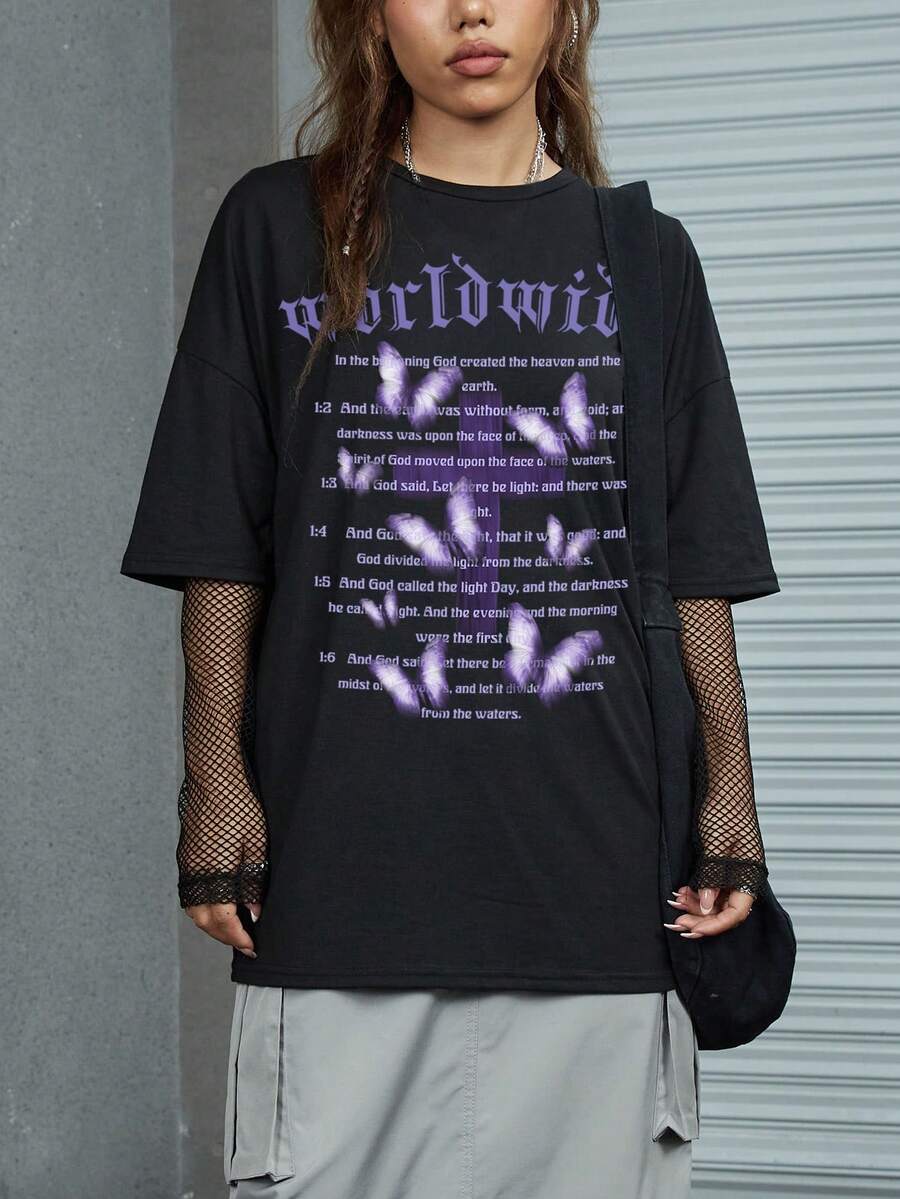 Goth Slogan & Butterfly Print Drop Shoulder Tee
