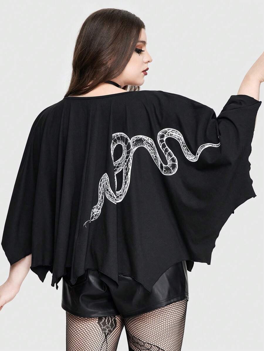 Goth Snake Print Batwing Deep V-Neck Tie-Up Plus Size Tunic T-Shirt