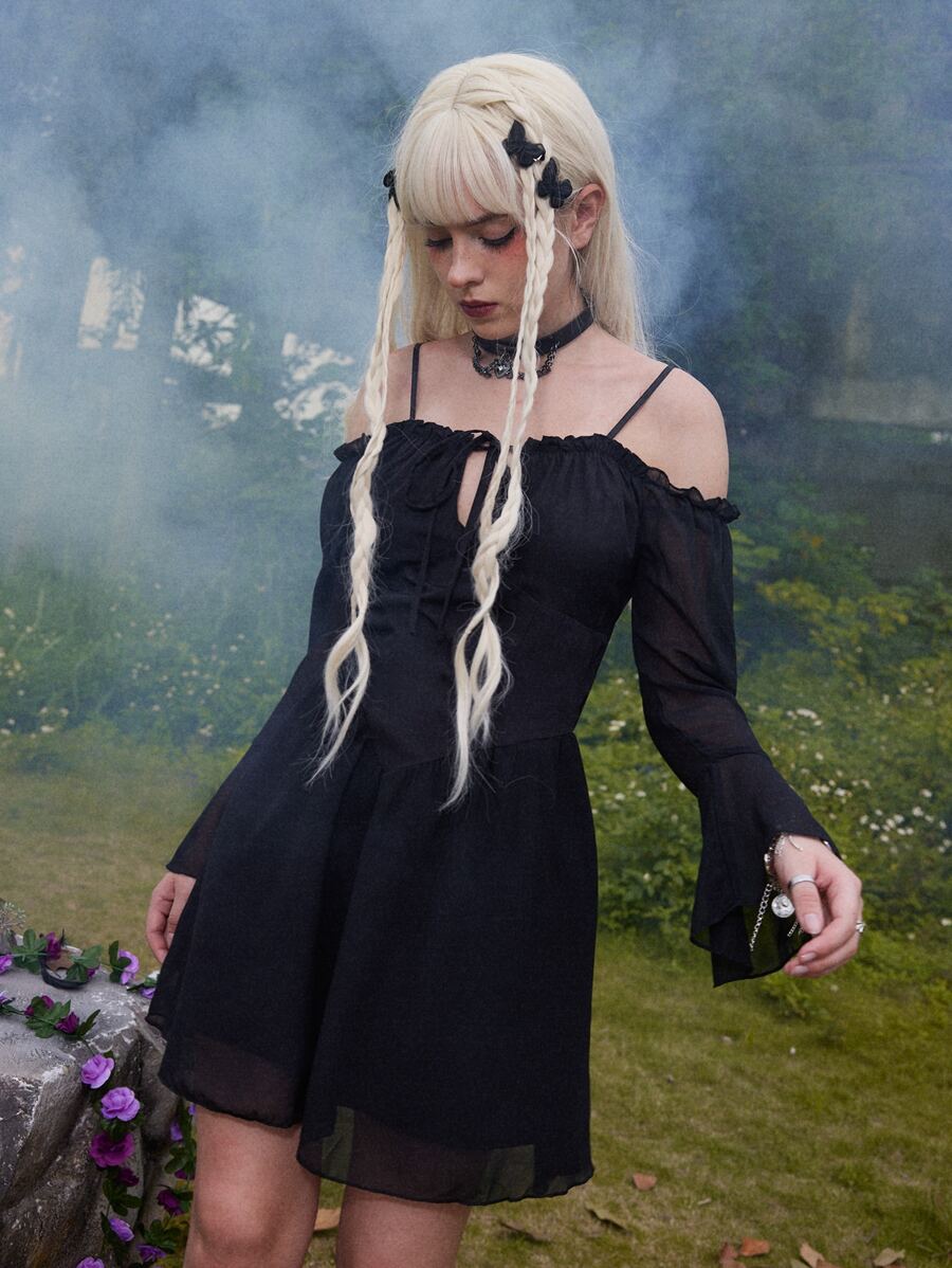 Goth Solid Tie Front Frill Cold Shoulder Dress Without Corset Belt