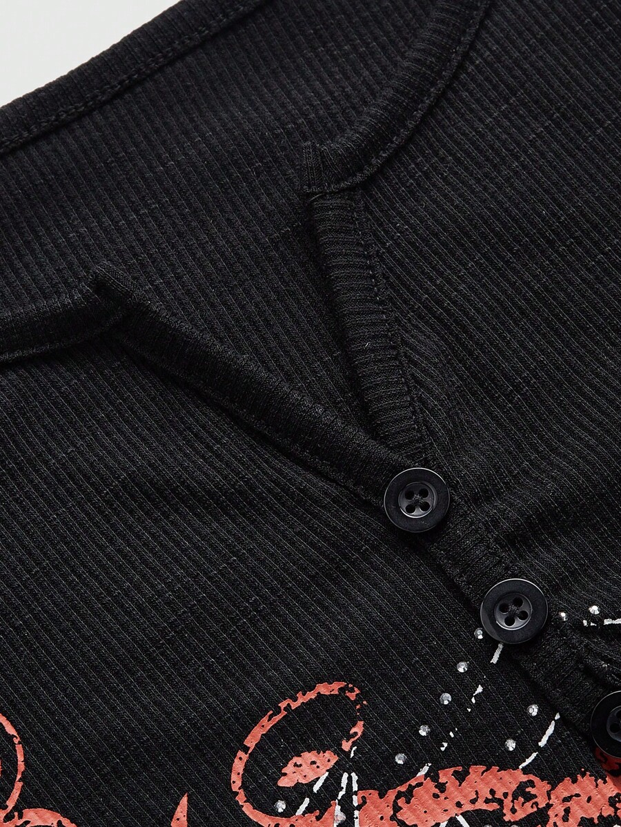 Goth Spring Spider Vine Print Rhinestone Embellished Slim-Fit V-Neck T-Shirt