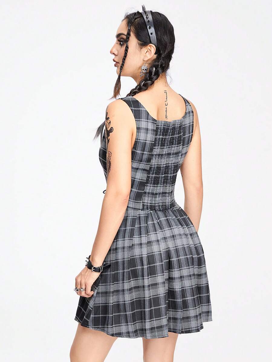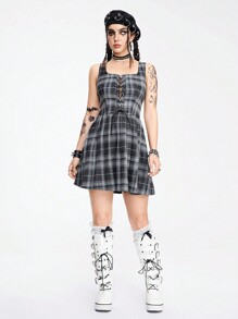 Goth Street Style Millennium Plaid Dress With Bowknot And Gatherings, Slim Fit For Women