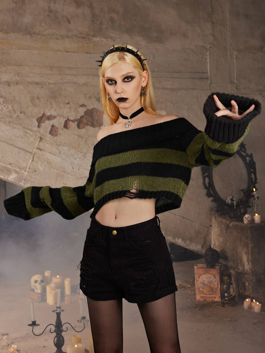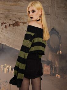 Goth Striped Pattern Off Shoulder Crop Sweater
