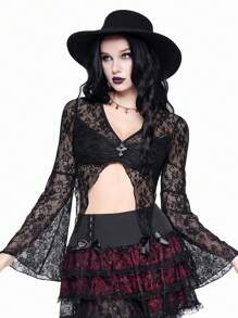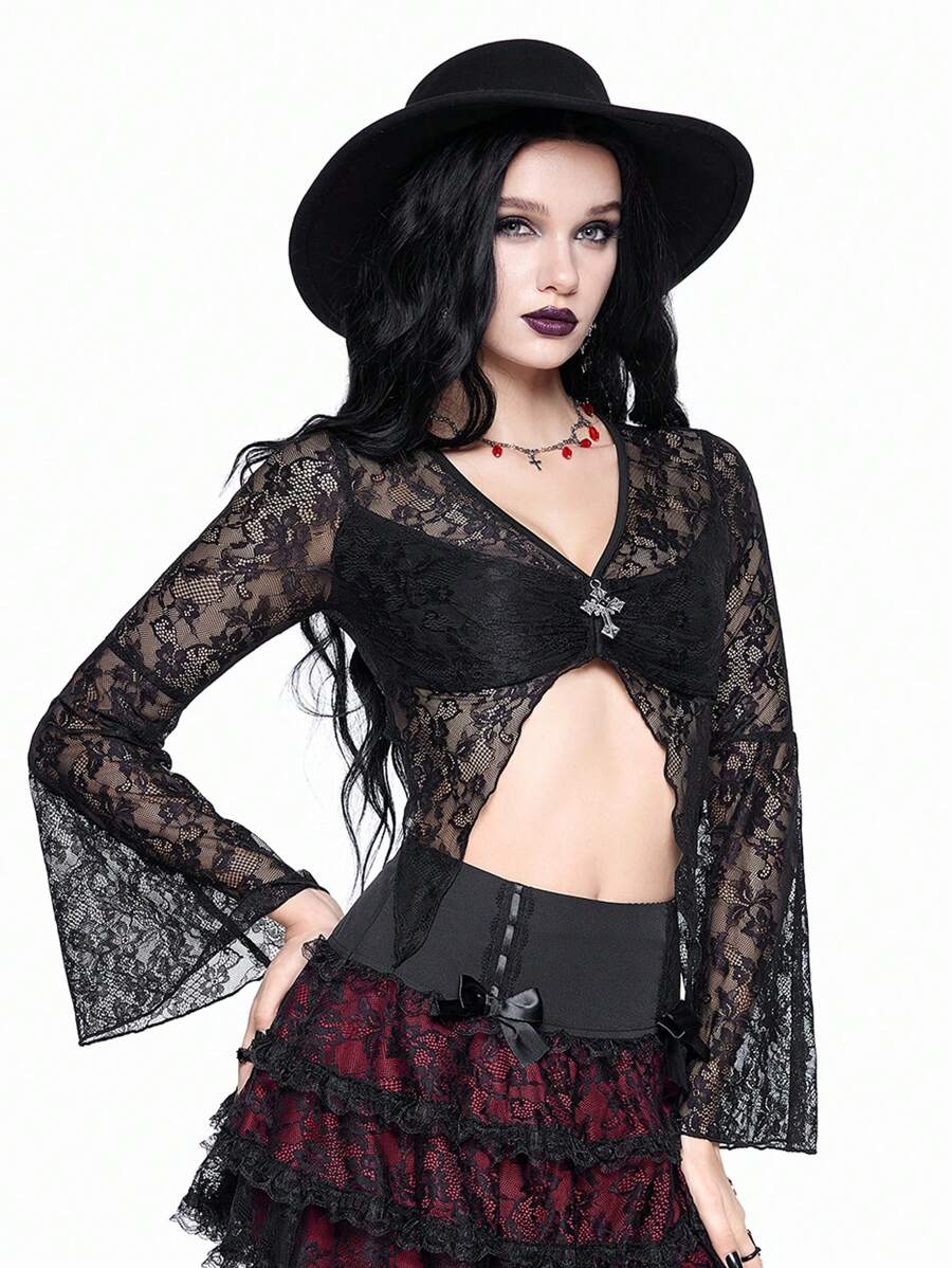 Valentine's Day Sexy Gothic Lace Trim Butterfly Cross Pendant Asymmetrical Hem Black Lace Long Sleeve Tee For Women