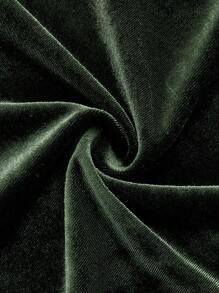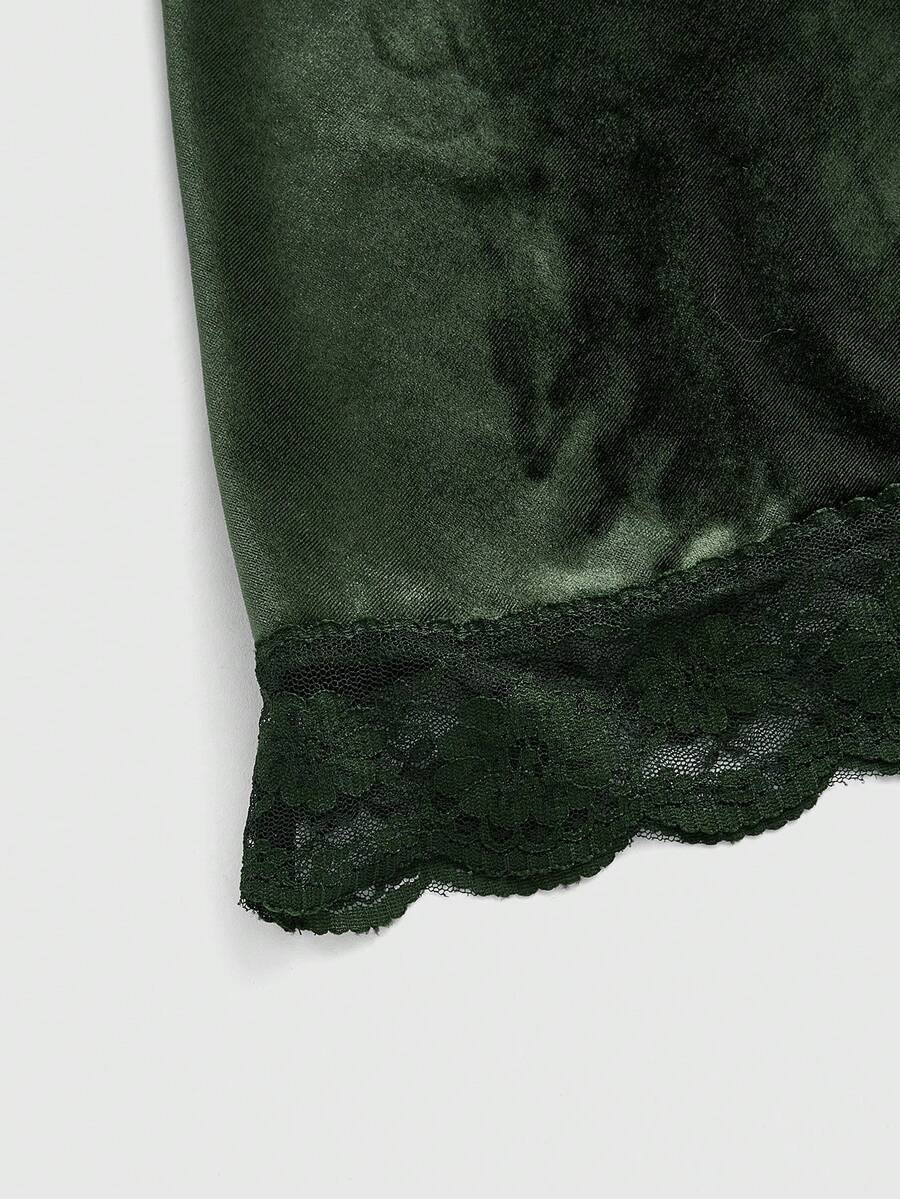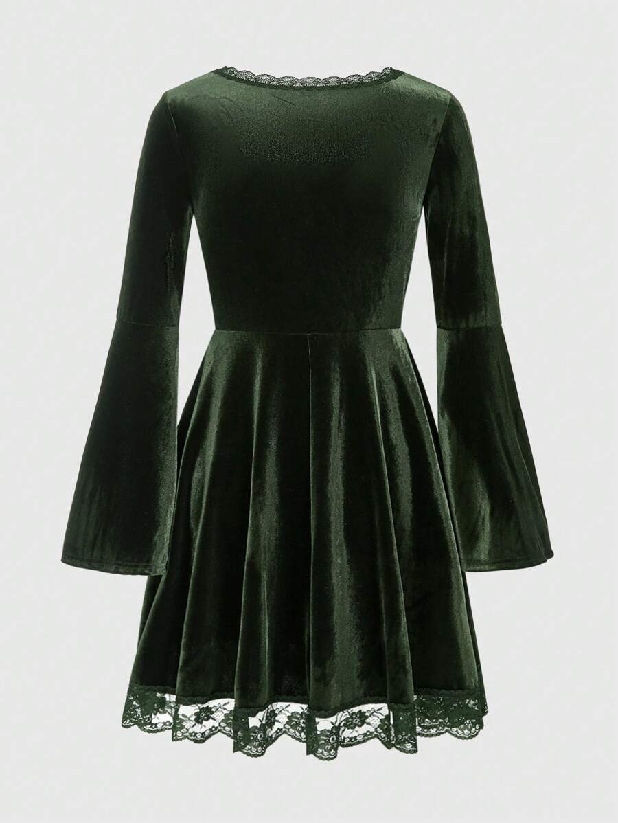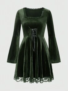 Goth Velvet Square Neckline Short Dress With Flared Sleeves, Lace Hem And Tie Waist