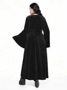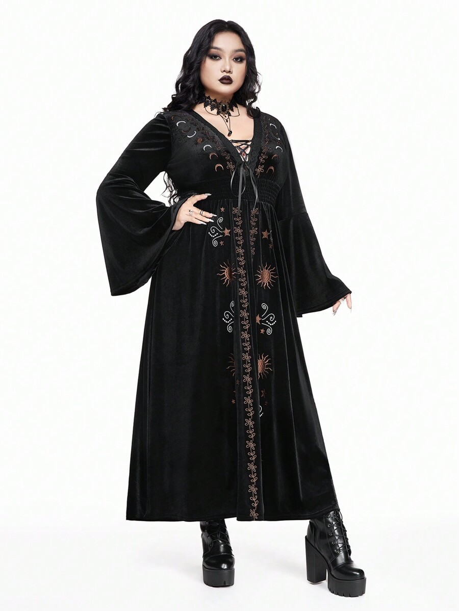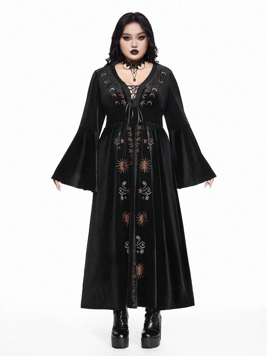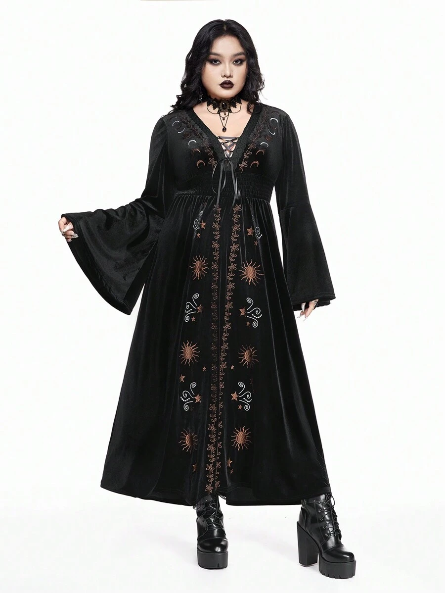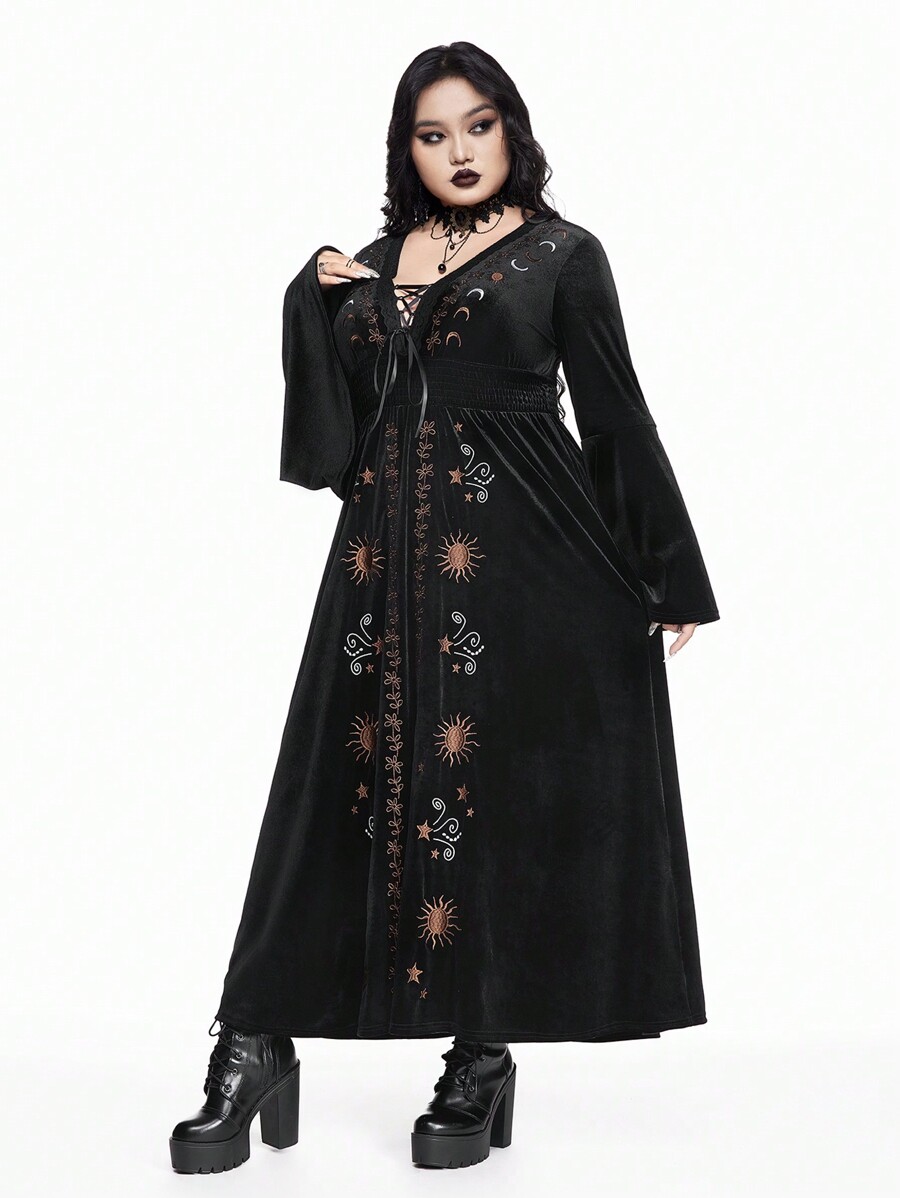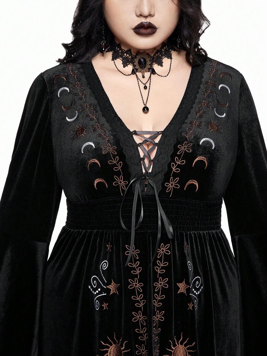 Goth Velvet Star & Moon Retro Embroidery Fit-And-Flare Long Sleeve Plus Size Dress