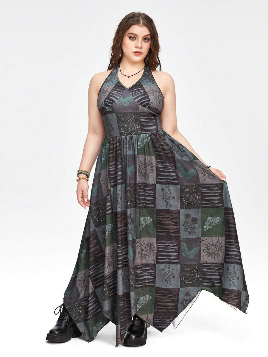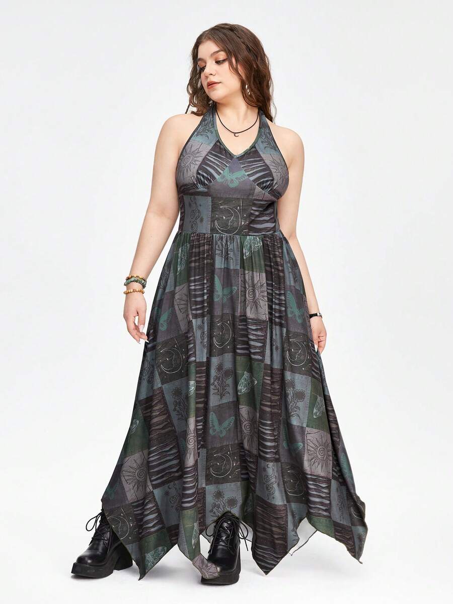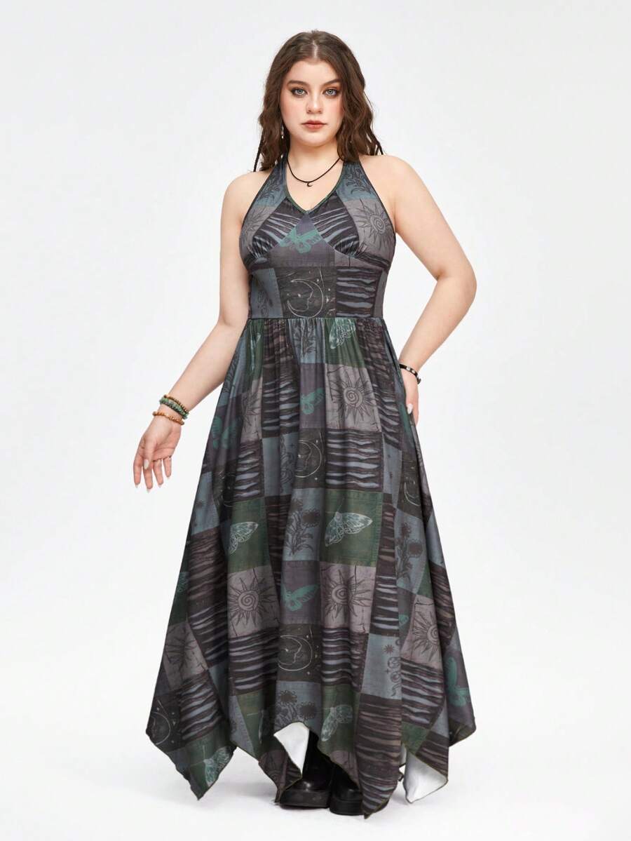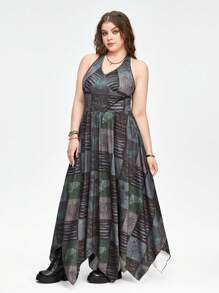 Goth Vintage Dark Bohemian Patchwork Printed Plus Size Swing Dress With Asymmetrical Hemline