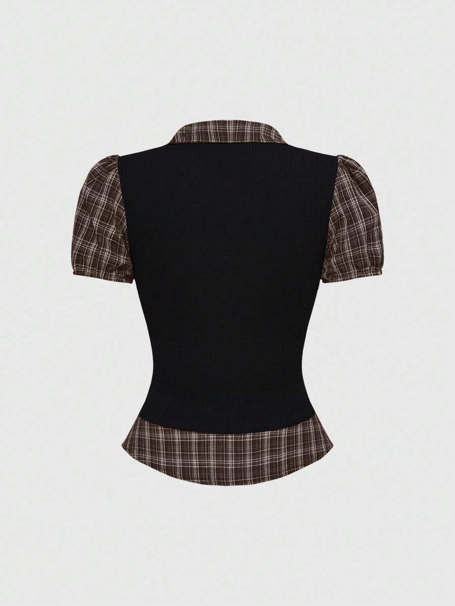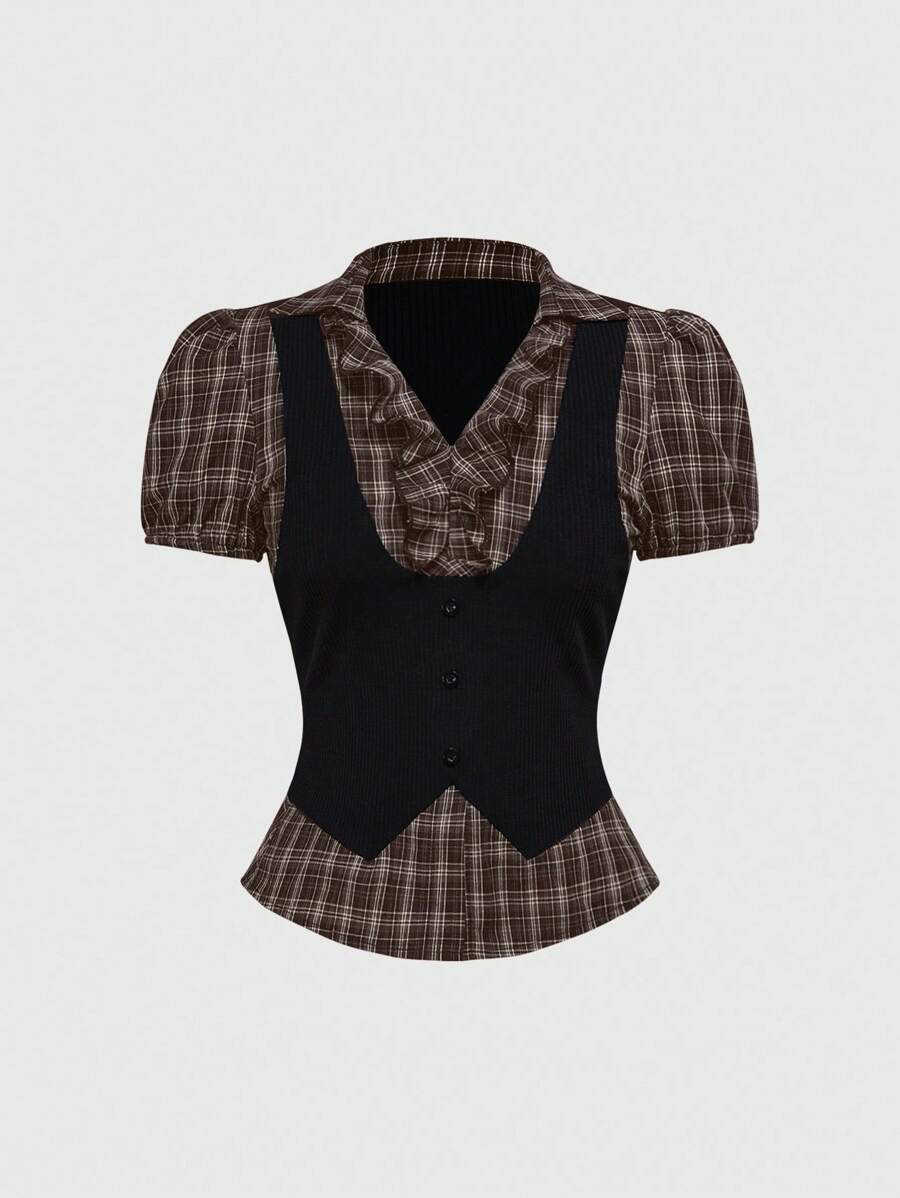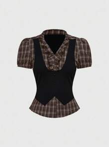Vintage Gothic College Style Plaid Patchwork 2 In 1 Women Shirt Top