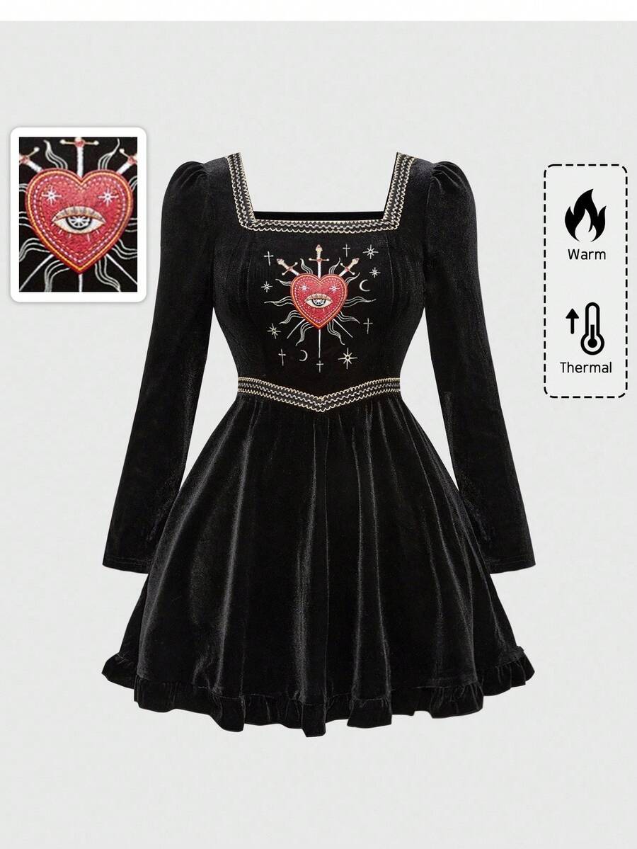 Vintage Gothic Dark Heart & Eye Embroidery Velvet Long Sleeve Dress, Halloween