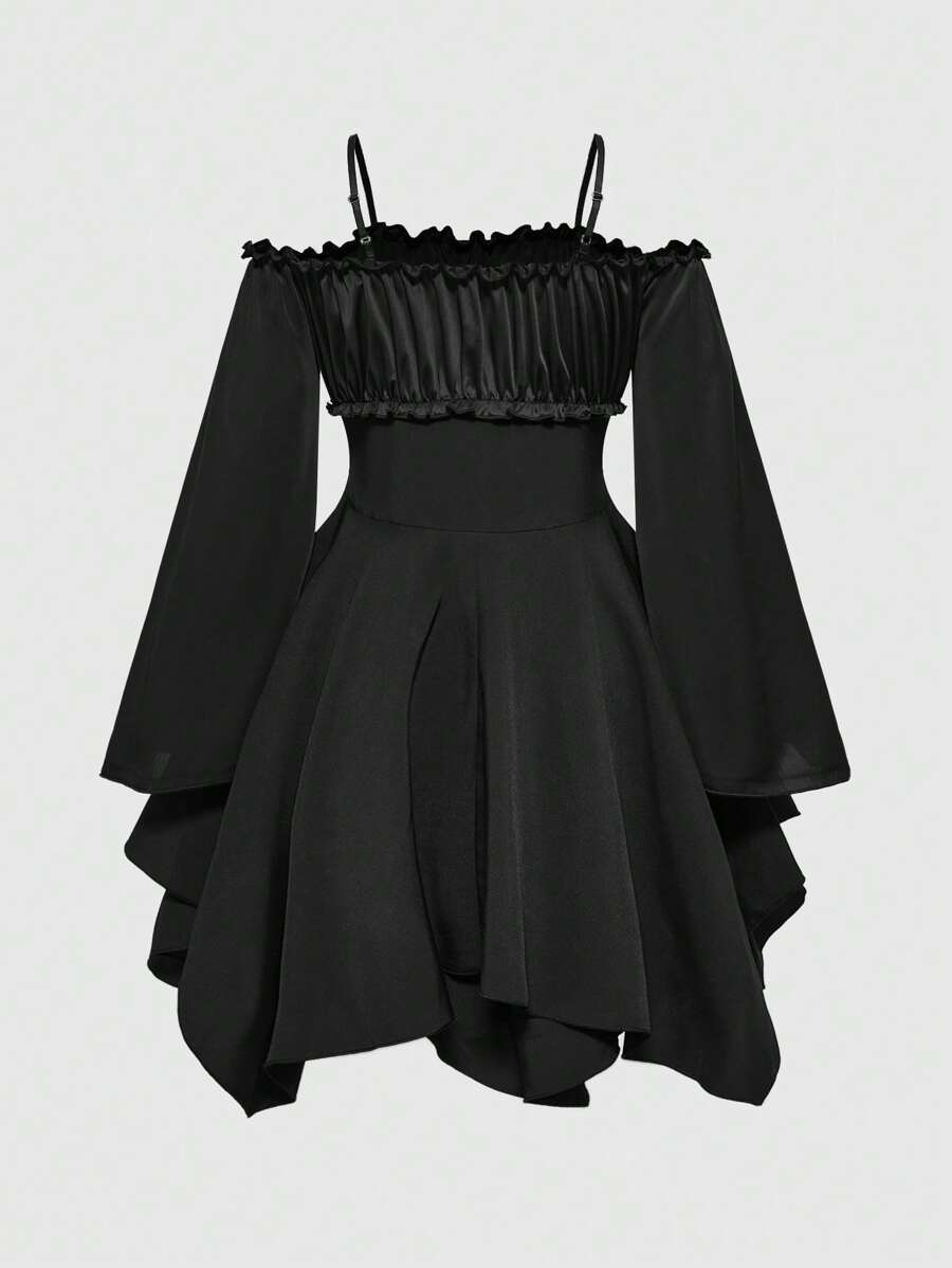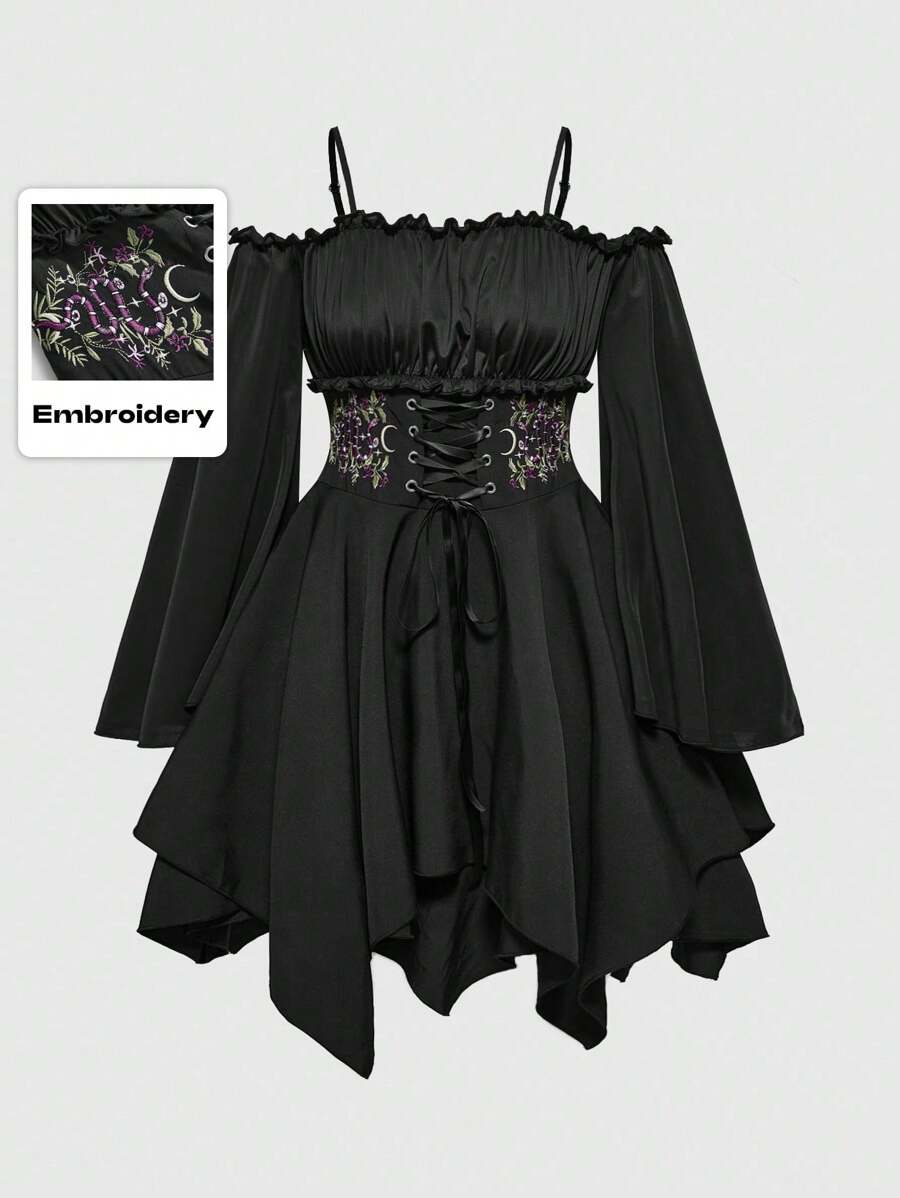 Goth Vintage Gothic Floral Snake Embroidery Off Shoulder Asymmetrical Hem Flare Sleeve Dress