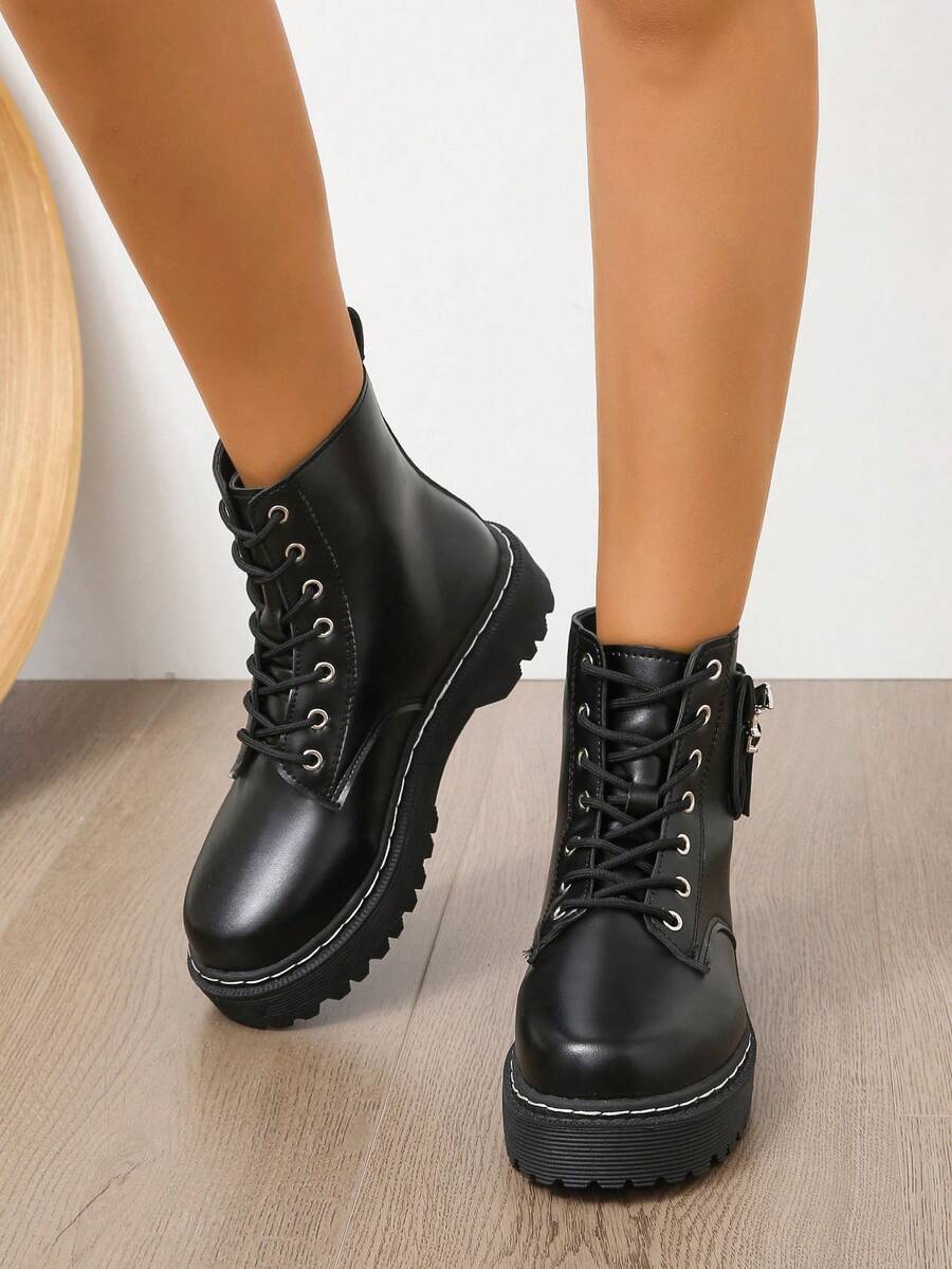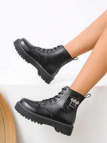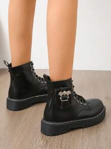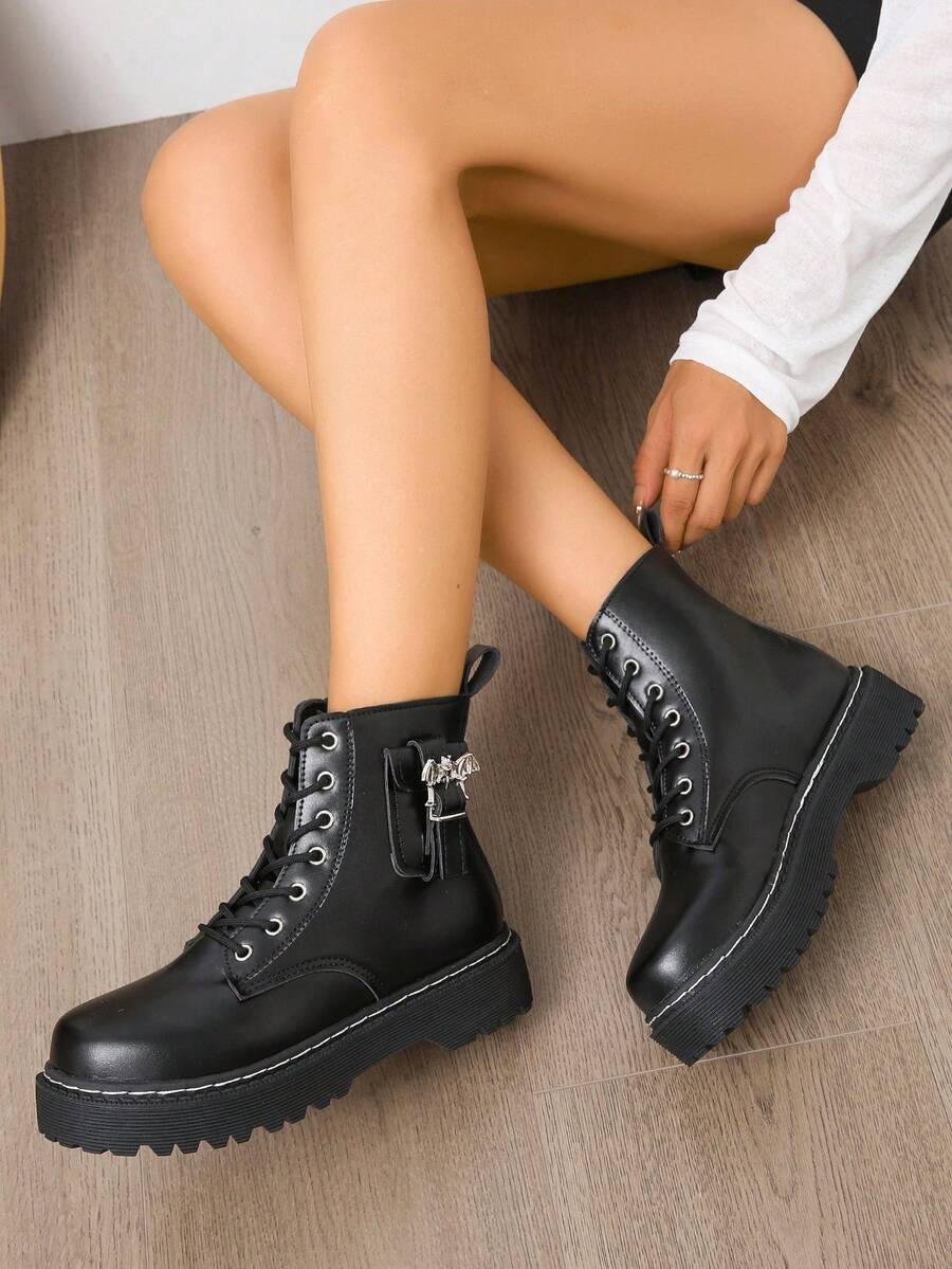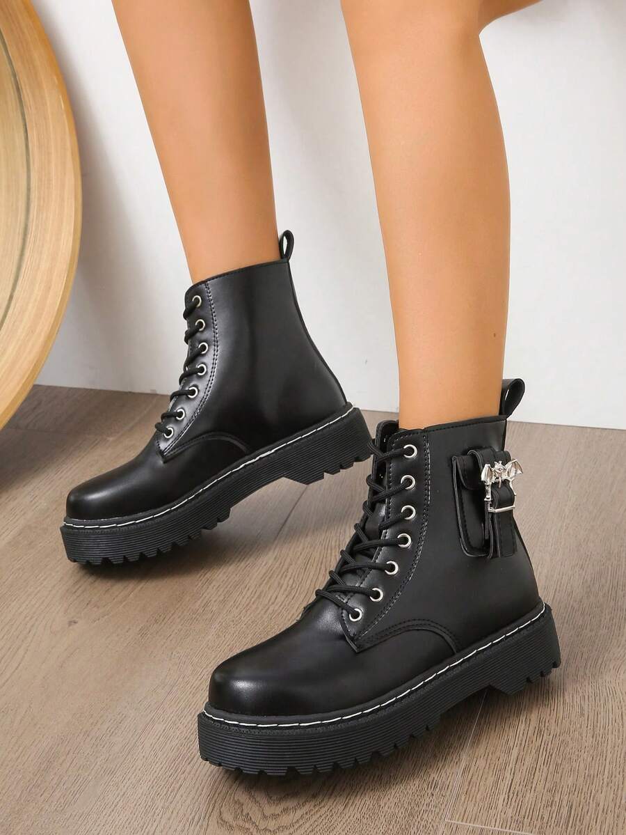 Goth Women Bat Metal Decor Lace-up Front Combat Boots, Cool Outdoor Fashion Boots