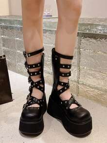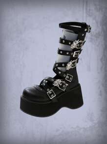 Goth Women Buckle & Studded Decor Round Toe Flatform Boots, Punk Outdoor Fashion Boots