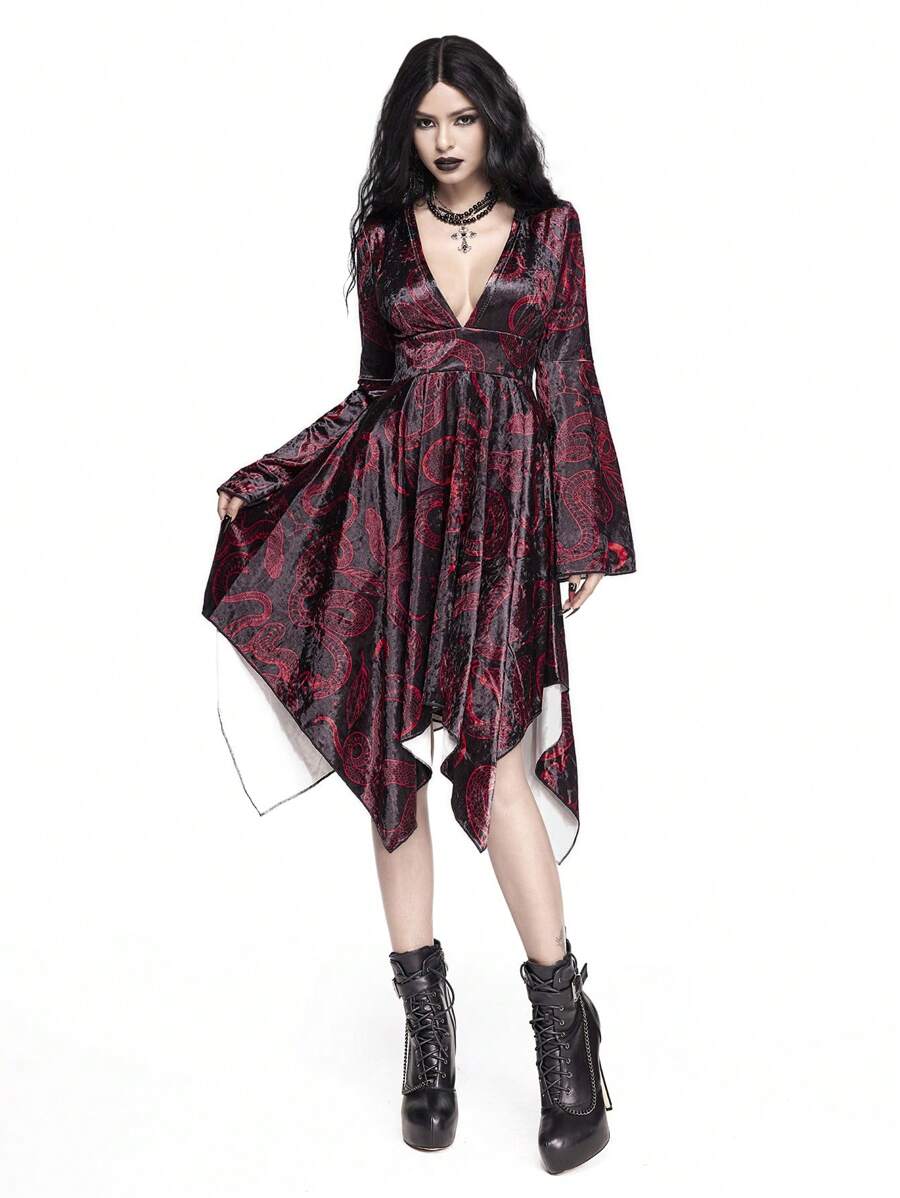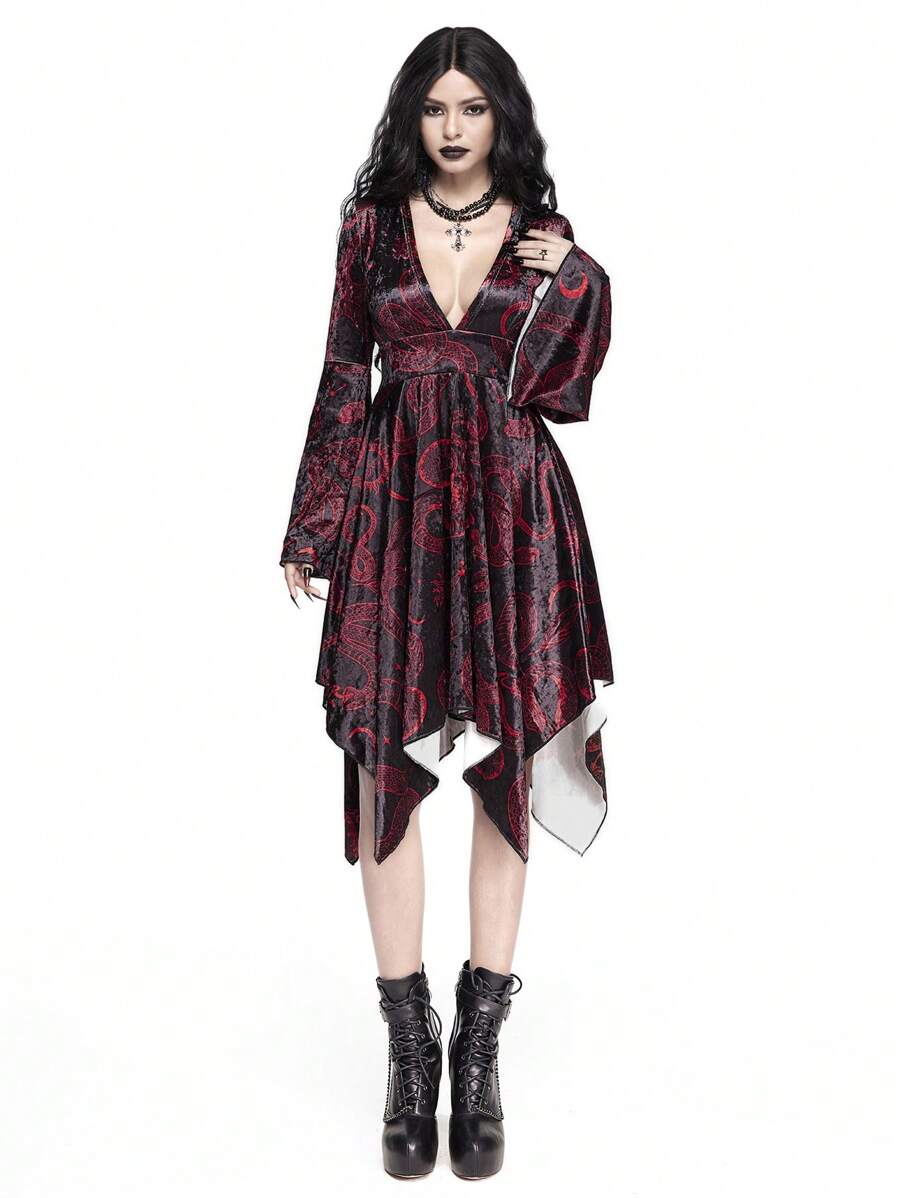 Goth Women Deep V-Neck Allover Print Asymmetric Hem Long Sleeve Mini Dress