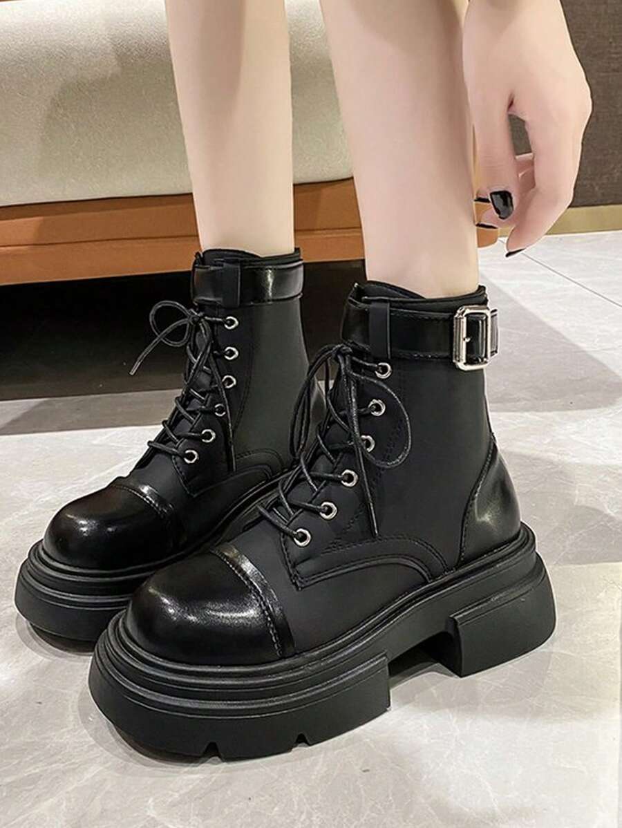 Goth Women Buckle Decor Lace Up Front Combat Boots, Cool Outdoor Fashion Boots