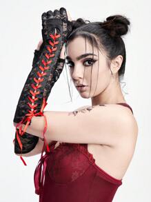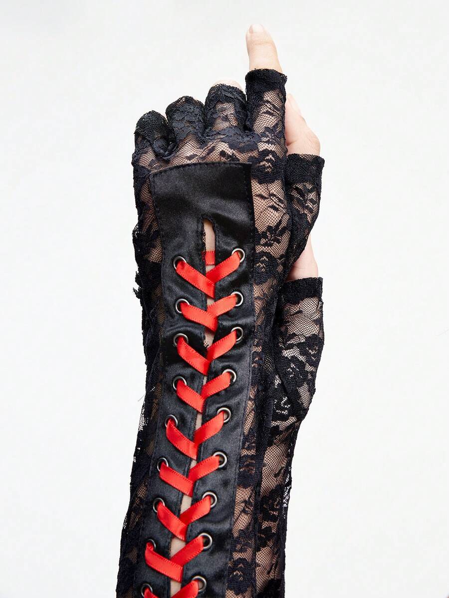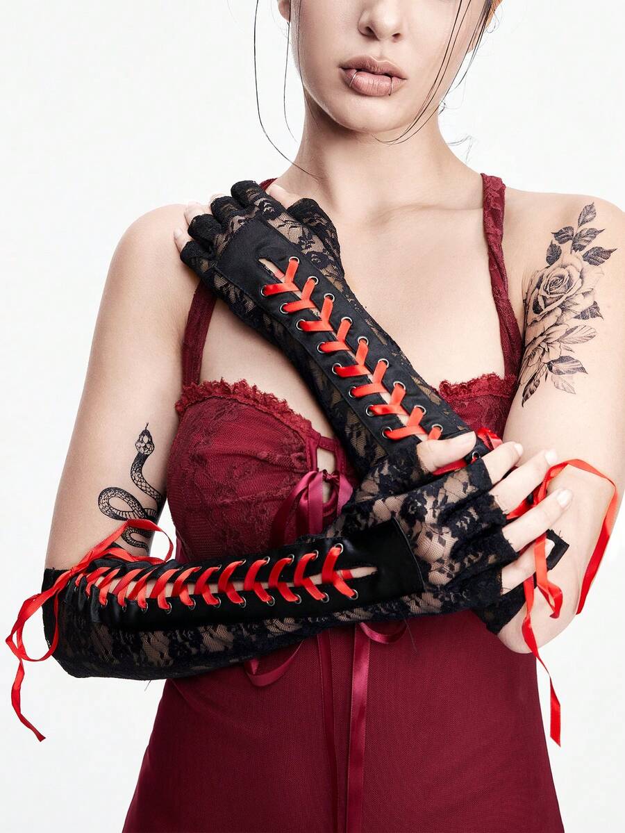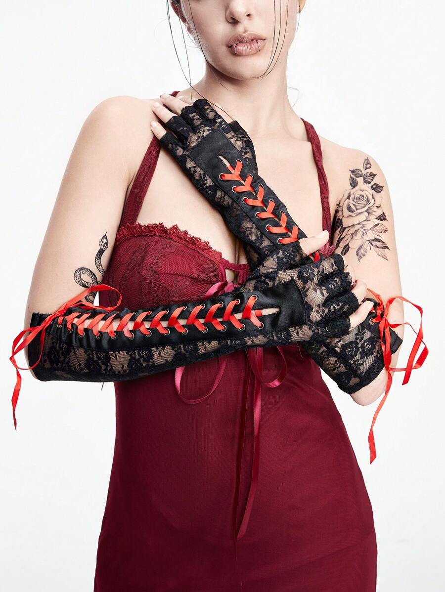 Goth Women Lace Decorated Crossed Strap Arm Sleeves