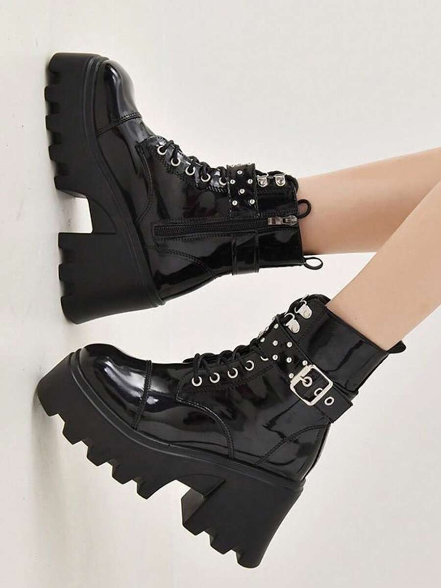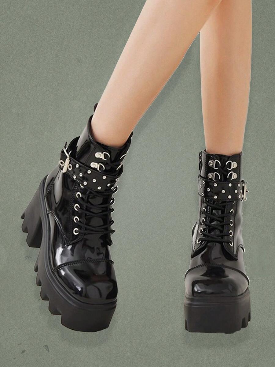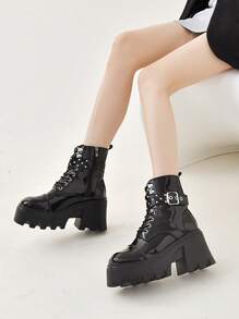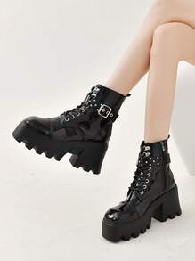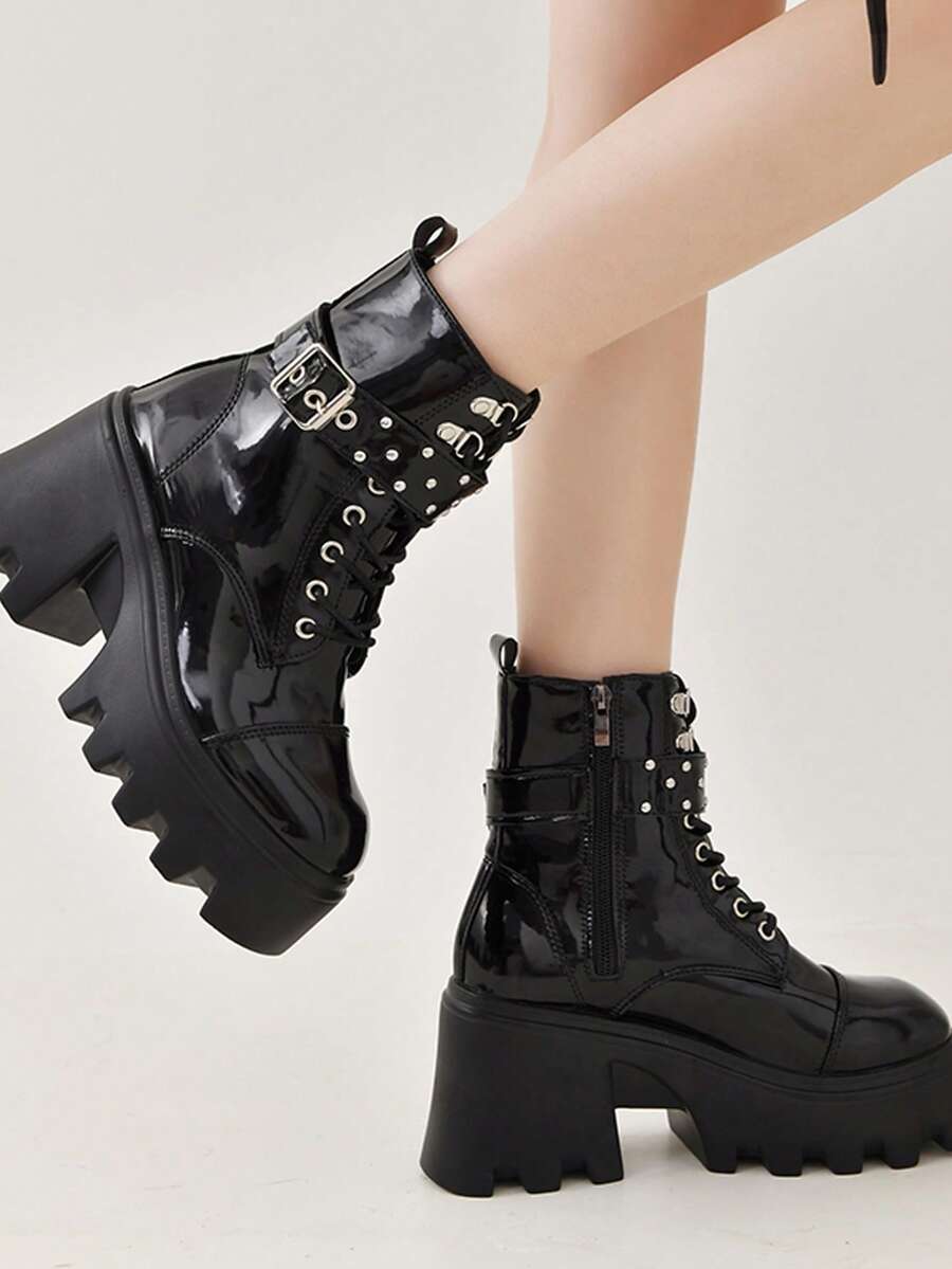Goth Women Lace-up Front Round Toe Platform Boots, Punk Buckle Decor Fashion Boots