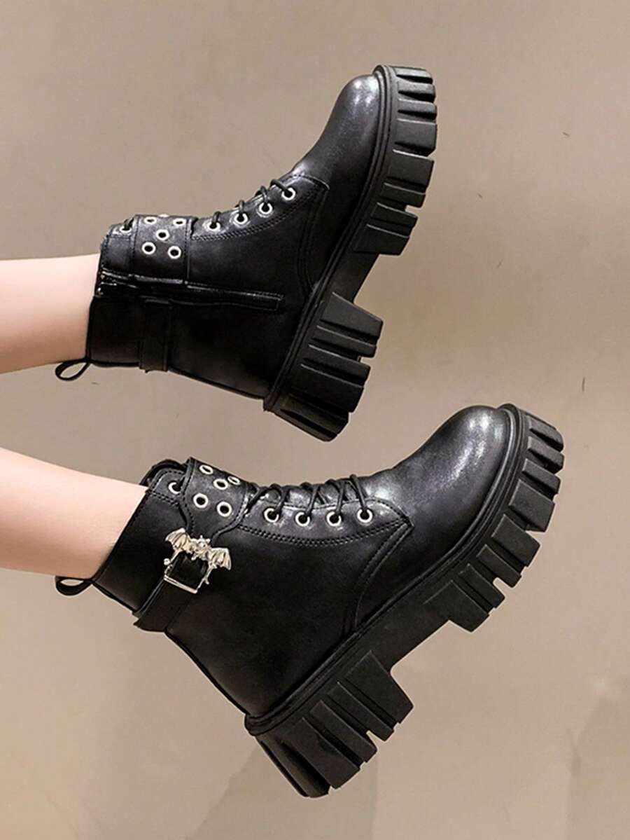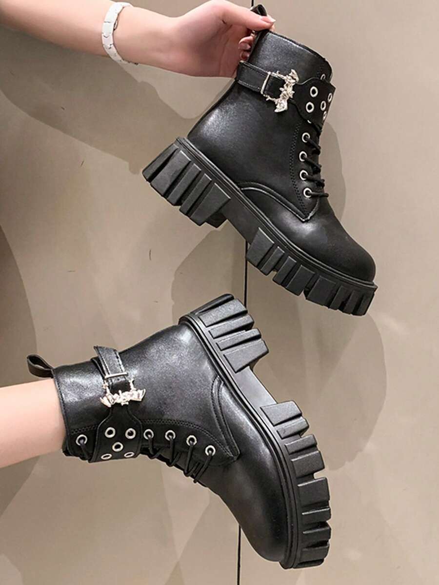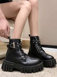 Goth Women Solid Buckle Decor Lace Up Front Combat Boots, Punk Outdoor Fashion Boots